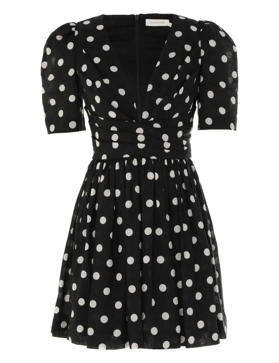 The V Neck Mini Dress In Black/Cream Dot From Our Resort 2024 Collection, Matchmaker. A Linen Mini Dress Featuring Short Sleeves And A Plunge Neckline, Finished With A Drape Detail Along The Waist.- Linen Mini Dress