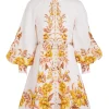 The Vacay Button Up Mini Dress In Golden Floral From Our Summer Swim 2023 Collection. A Linen Mini Dress Featuring Buttons Down Centre Front, Top Stitching And A Self Tie Beaded Belt- Linen Mini Dress