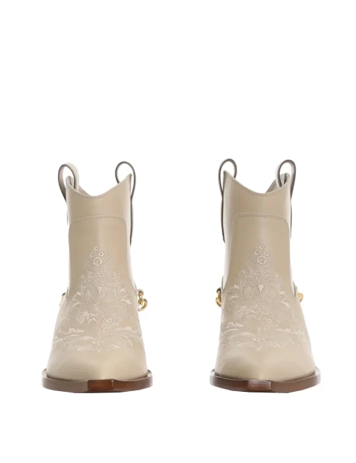 The Zimmermann Duncan Low Boots 45 In Bone From Our Fall 2023 Collection, Luminosity. A Leather Western Boot Featuring Custom Engraved Stirrup Hardware.- Made In Italy