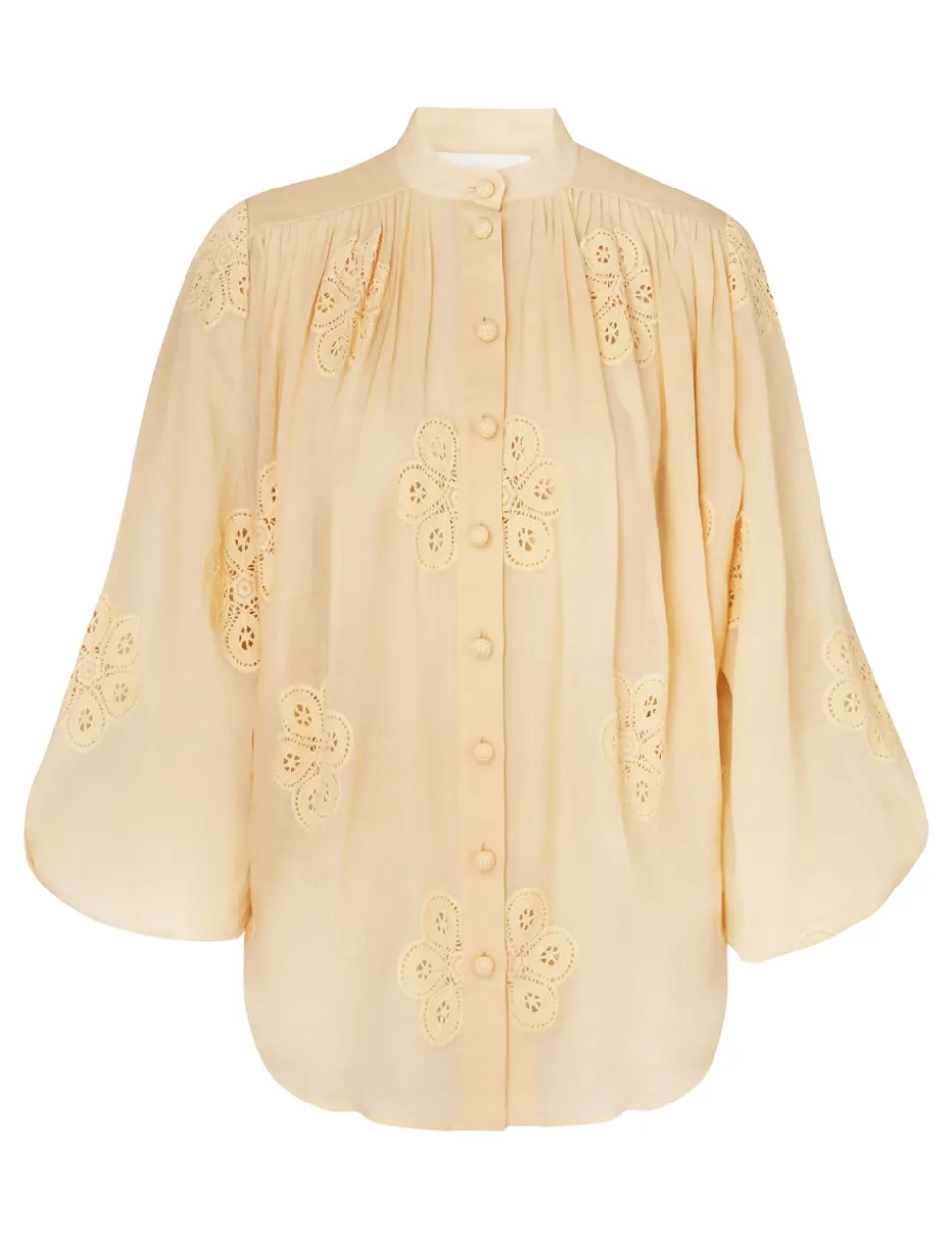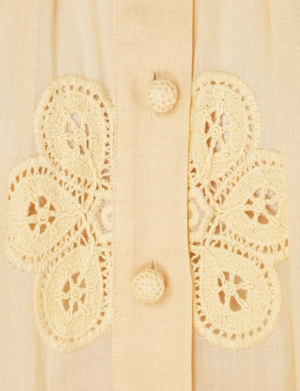 The Acadian Embroidered Blouse In Sand From Our Resort Swim 2024 Collection. A Long Sleeve Ramie Blouse Featuring Buttons Down The Centre Front, Placement Embroidery And Pleats Along The Neckline.- Ramie Blouse