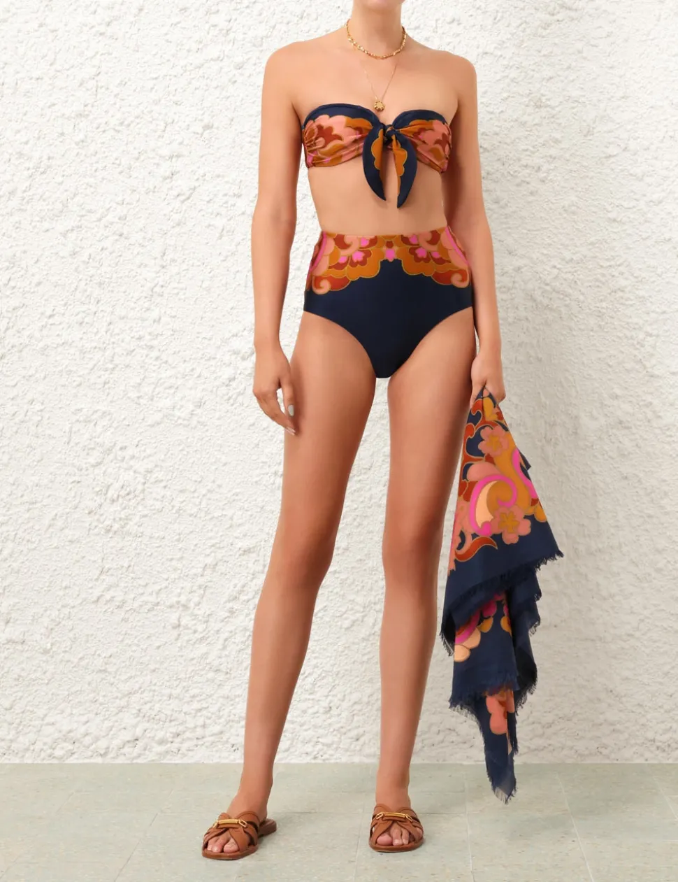 The Acadian Scarf Tie Bra In Navy Paisley From Our Resort Swim 2024 Collection. A Lycra Bandeau Style Bikini Featuring Removable Cups, Straps, And Boning.- Lycra Bandeau Bikini Top