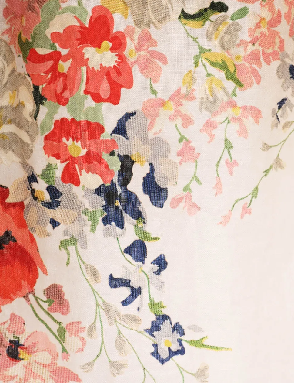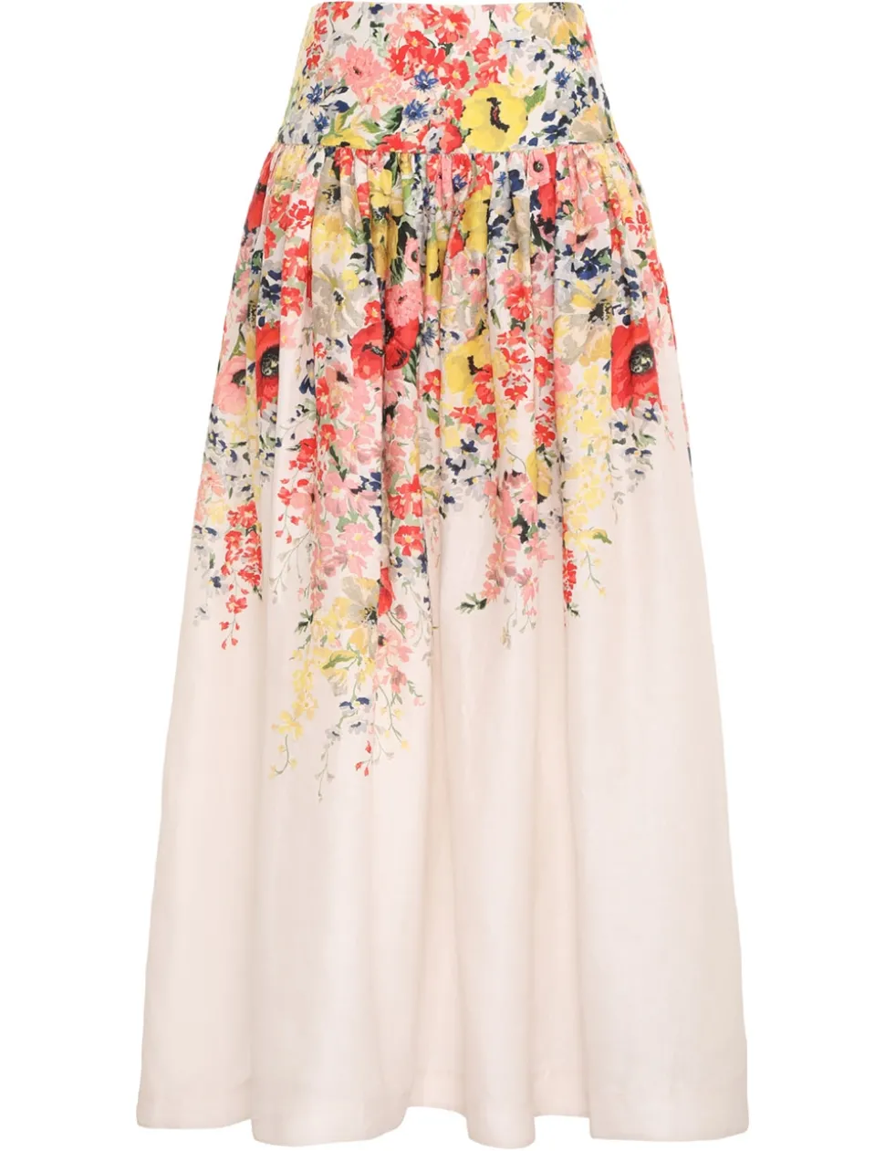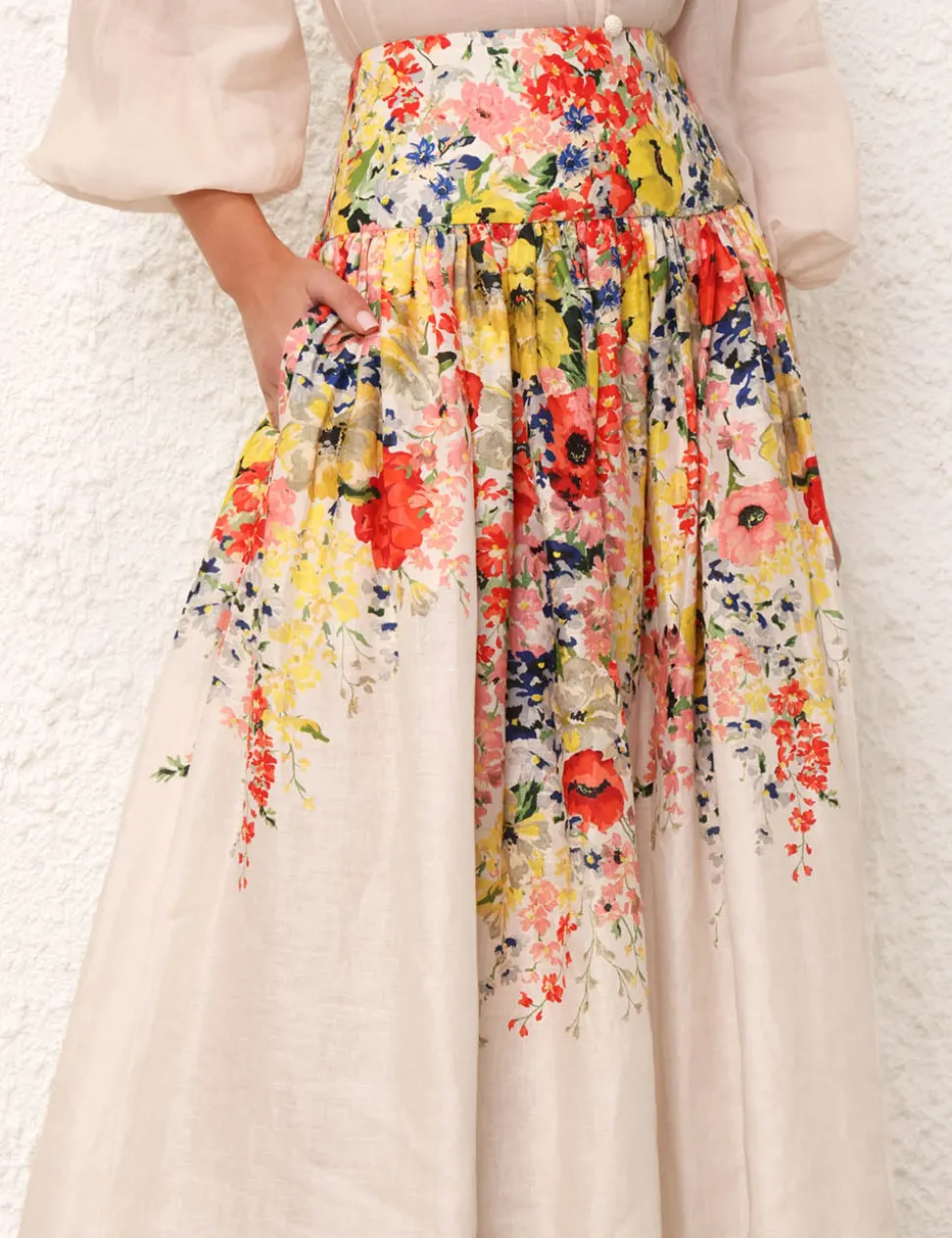The Alight Midi Skirt In Ivory Floral From Our Resort Swim 2024 Collection. A Linen Midi Skirt Featuring A Wide Waistband And Side Seam Pockets.- Linen Midi Skirt
