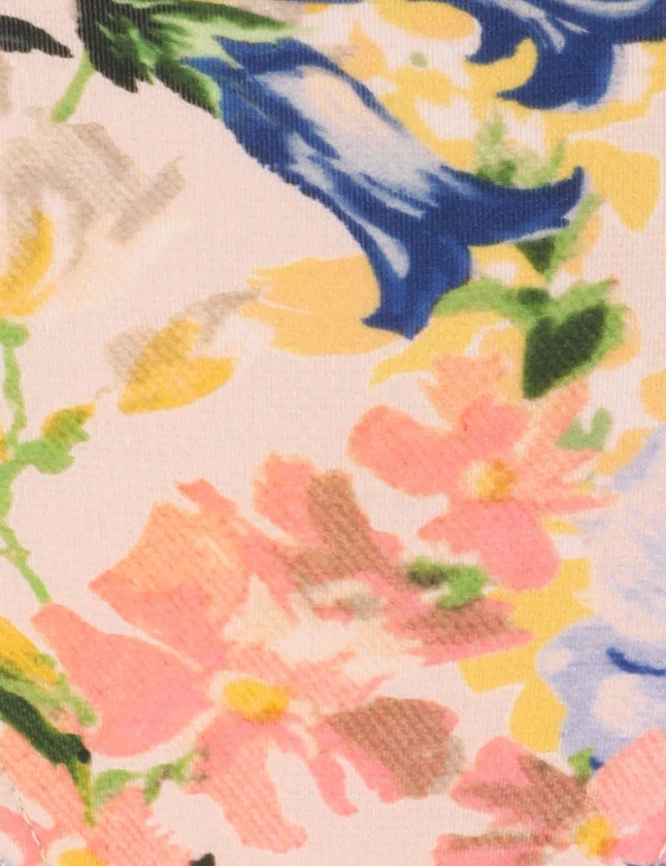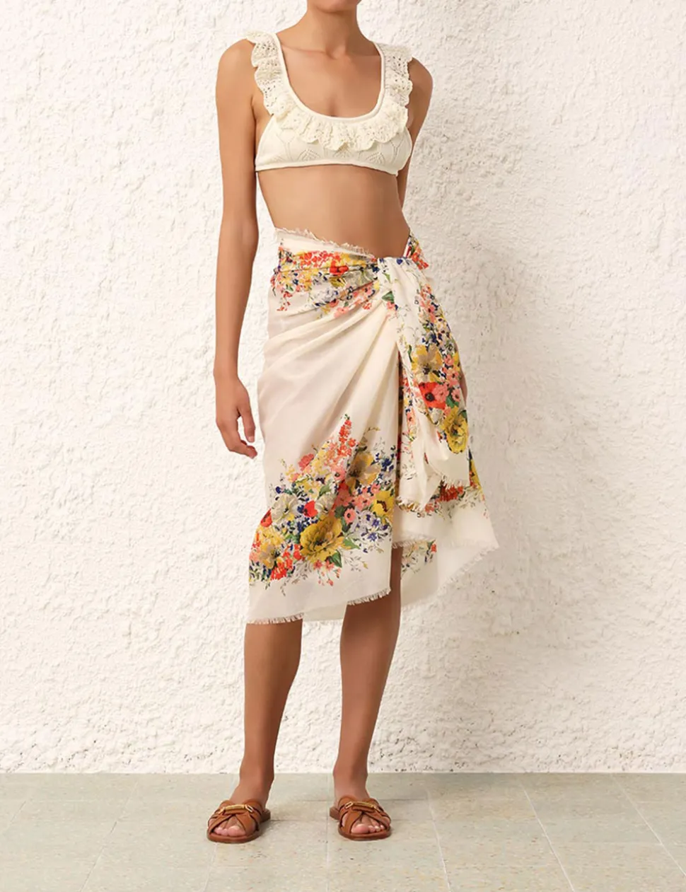 The Alight Frill Knit Scoop Bikini In Ivory Floral From Our Resort Swim 2024 Collection. A Crochet Scoop Neck Bra Featuring Toggles On Tie Ends And A Printed Lycra Pant.- Crochet Bra And Lycra Pant