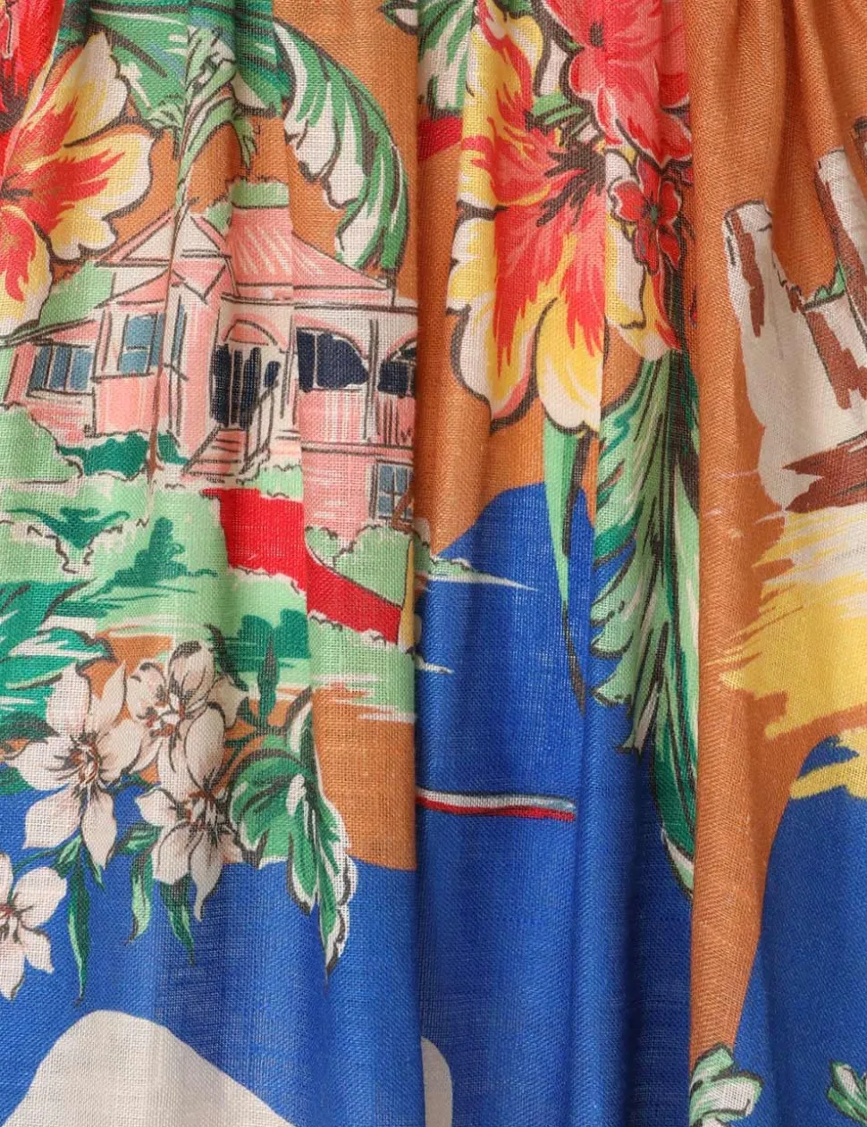 The Alight Picnic Dress In Nautical Map From Our Resort Swim 2024 Collection. A Linen Midi Dress Featuring Contrast Straps And Piping, Shirring At The Centre Back And A Gathered Skirt.- Linen Midi Dress