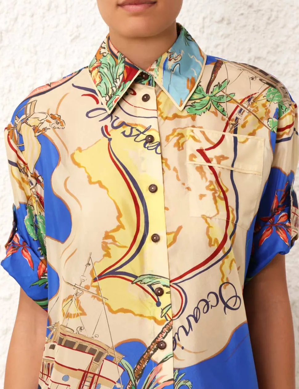 The Alight Short Sleeve Shirt In Nautical Map From Our Resort Swim 2024 Collection. A Short Sleeve Silk Shirt Featuring A Placement Print And Contrast Piping.- Short Sleeve Button Up Shirt