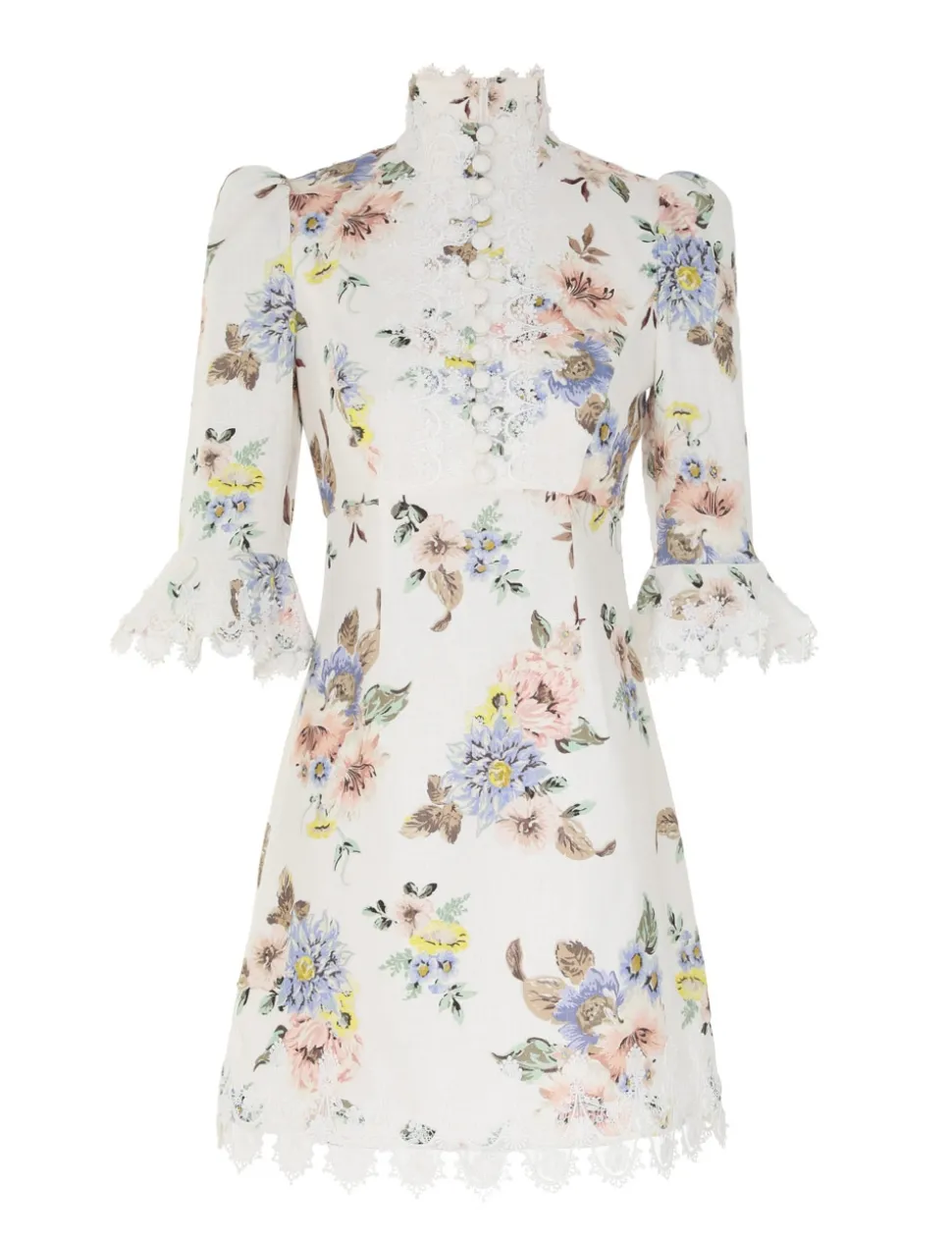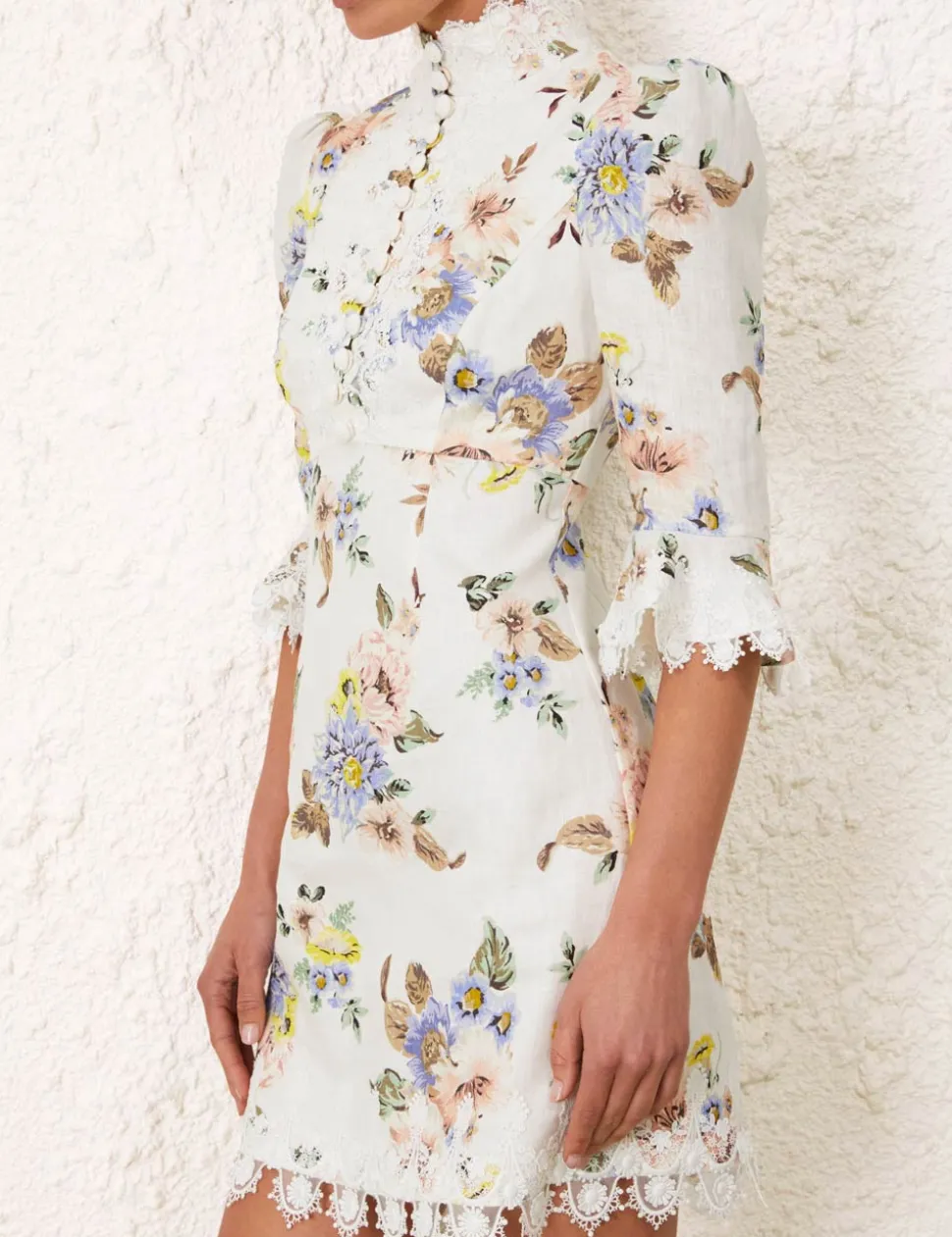 The Applique Mini Dress In Blue Floral From Our Resort 2024 Collection, Matchmaker. A Linen Mini Dress Featuring A Mandarin Collar And Short Sleeves With Fluted Cuffs, Finished With Lace Trims Throughout.- Linen Mini Dress