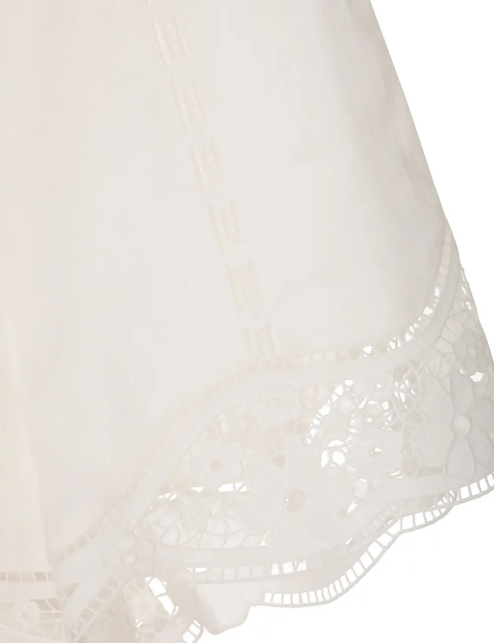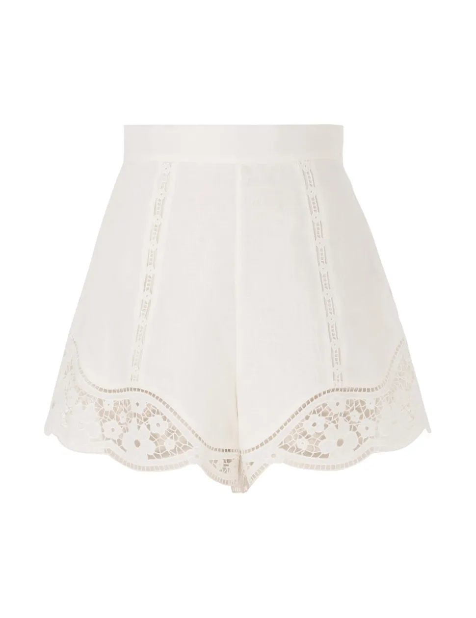 The August Broderie Shorts In Ivory From Our Resort Swim 2024 Collection. A High Waisted Short Featuring Panels Of Broderie Lace Throughout.- Linen High Waisted Short