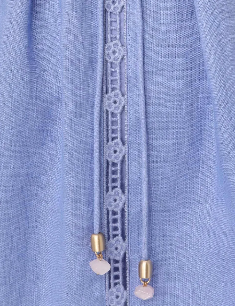 The August Broderie Slip Dress In Dusty Blue From Our Resort Swim 2024 Collection. A Linen Slip Dress Featuring Self Tie Rouleau Straps And Panels Of Broderie Lace Throughout.- Linen Midi Dress