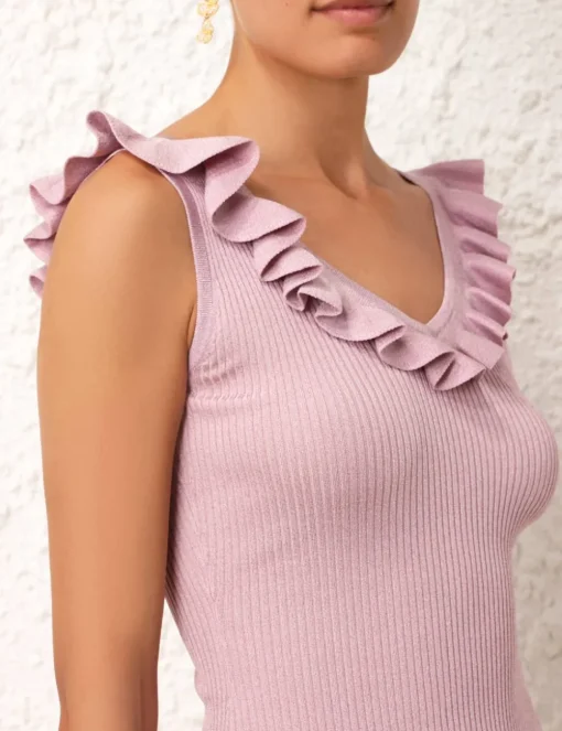 The August Frill V-Neck Top In Dusty Pink Lurex From Our Resort Swim 2024 Collection. A Ribbed Knit, Fitted Tank With A Frilled V-Neckline.- Fitted, Ribbed Tank