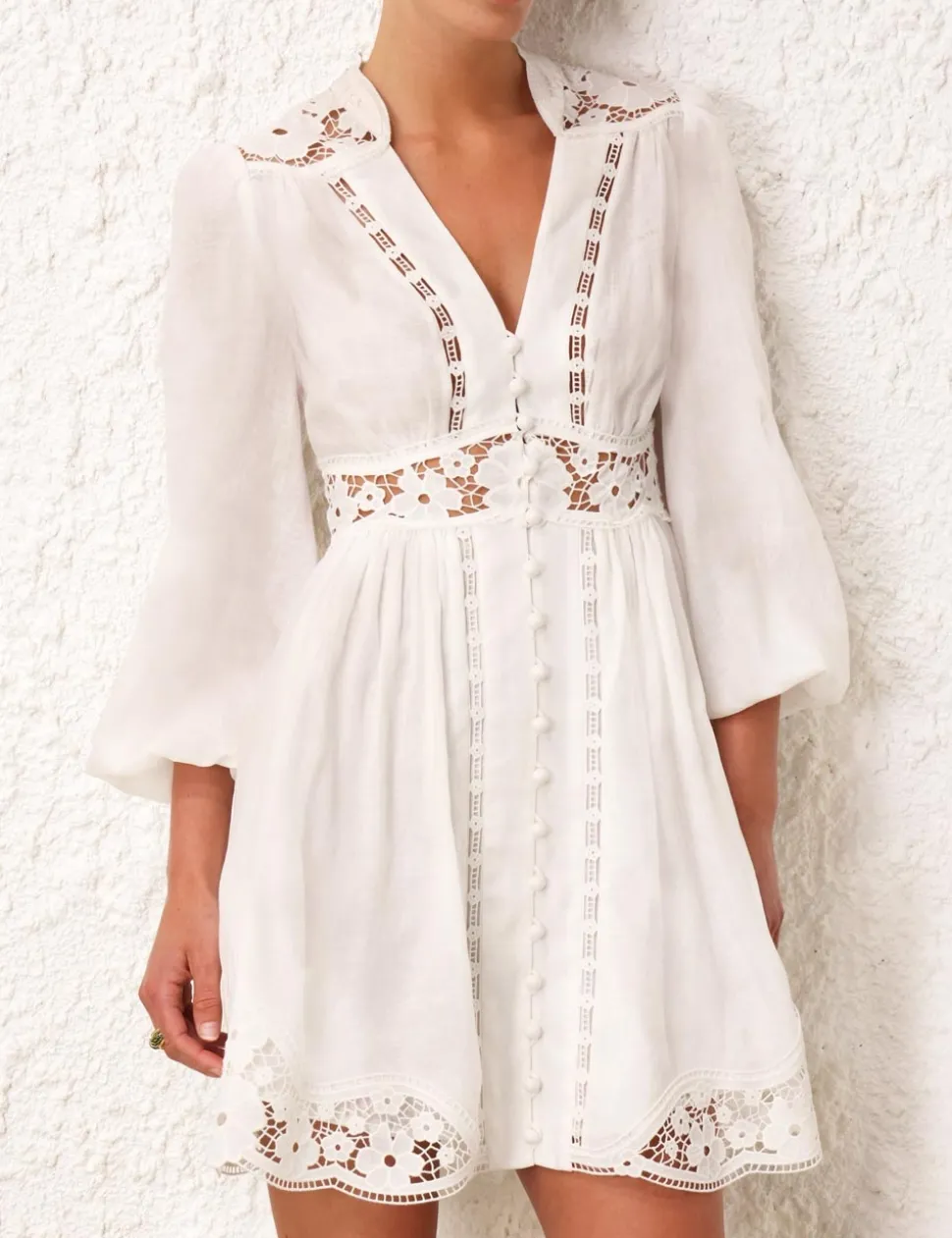 The August Plunge Mini Dress In Ivory From Our Resort Swim 2024 Collection. A Linen Long Sleeve Dress Featuring A Plunging Neckline And Spaghetti Loops Along The Centre Front.- Long Sleeve Mini