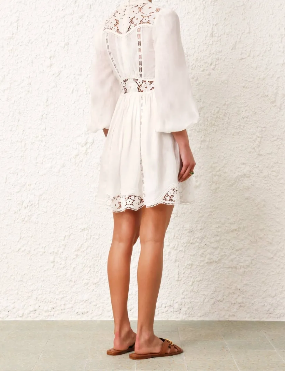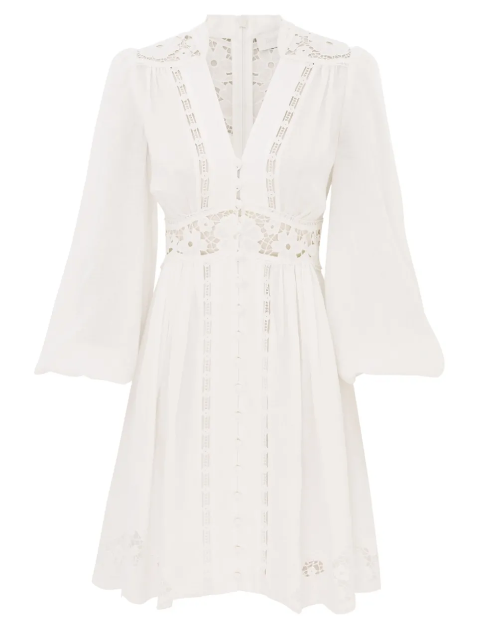 The August Plunge Mini Dress In Ivory From Our Resort Swim 2024 Collection. A Linen Long Sleeve Dress Featuring A Plunging Neckline And Spaghetti Loops Along The Centre Front.- Long Sleeve Mini