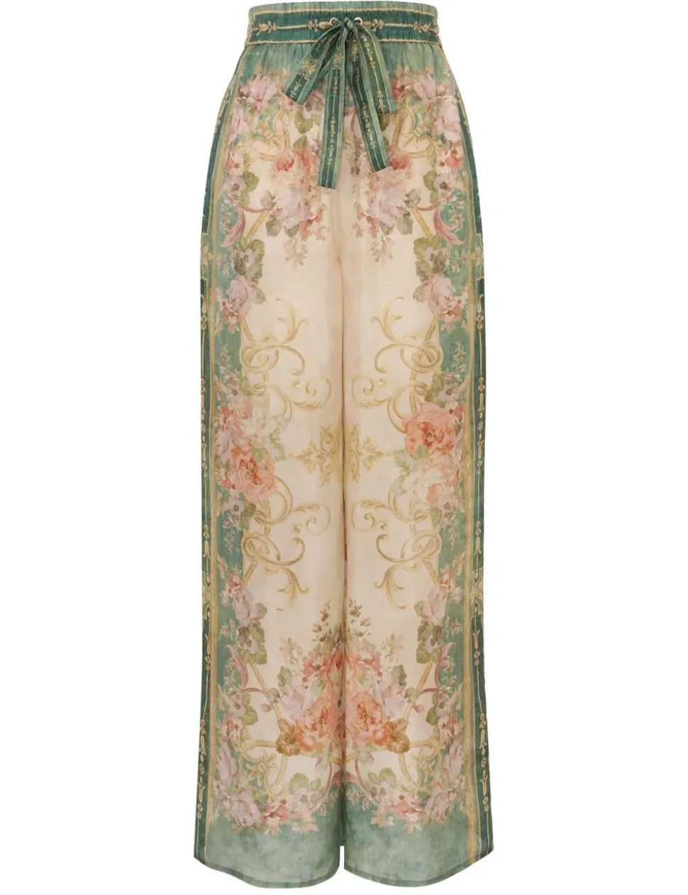 The August Relaxed Pant In Khaki Floral From Our Resort Swim 2024 Collection. A Silk Wide Leg Pant Featuring Side Seam Pockets And A Drawcord Waistband.- Silk Wide Leg Pant