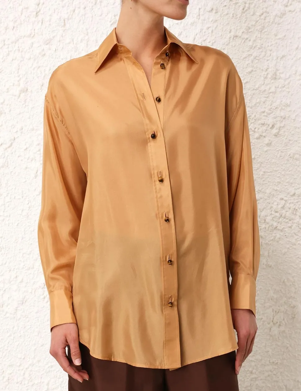 The August Relaxed Shirt In Biscuit From Our Resort Swim 2024 Collection. A Long Sleeve Silk Shirt Featuring Buttons Down The Centre Front And On The Cuffs.- Silk Shirt