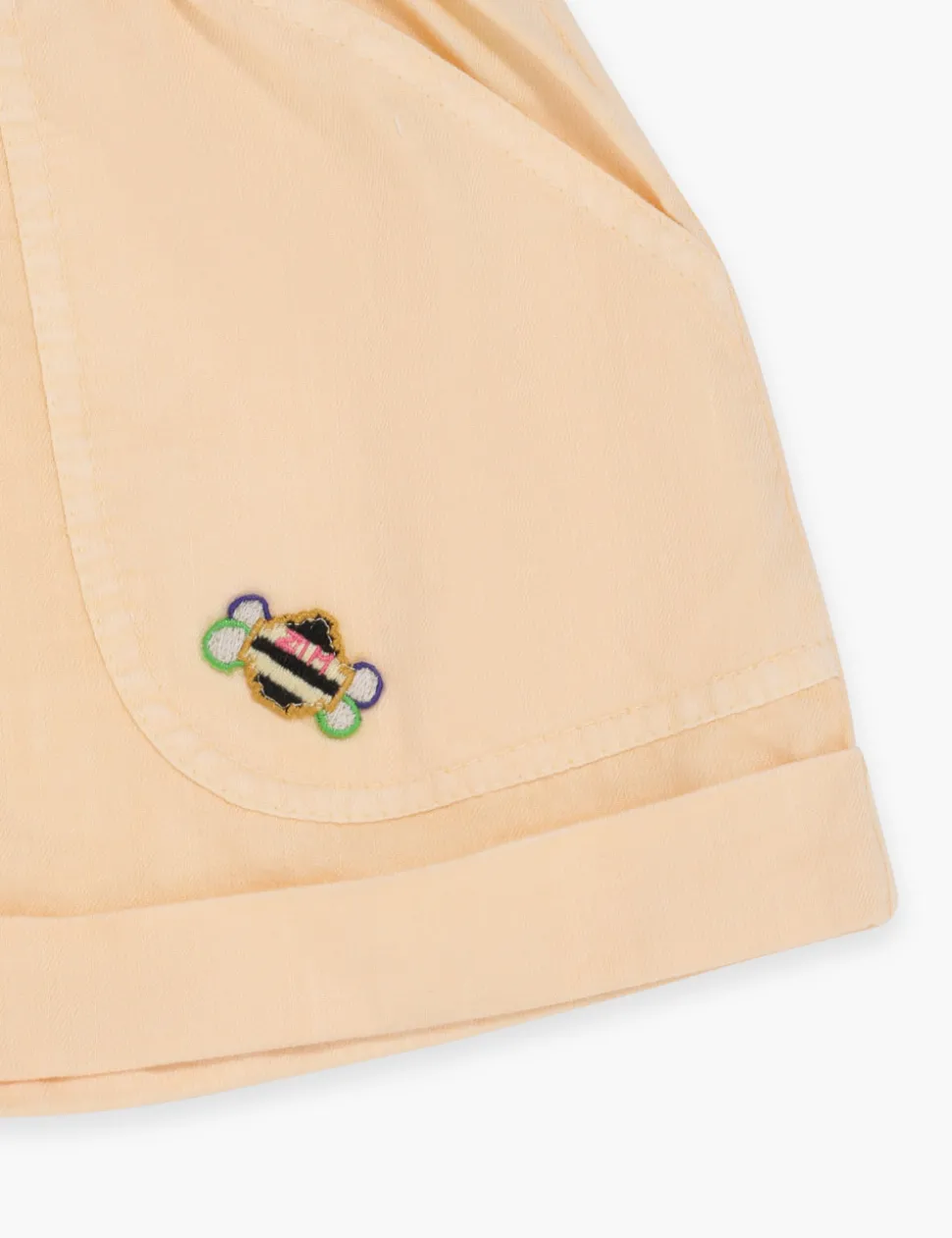 The August Utility Denim Short In Macaroon From Our Resort Swim 2024 Collection. A Denim Short With An Elasticated Waistband, Fixed Waist Tie And Patch Pockets.- Denim Short
