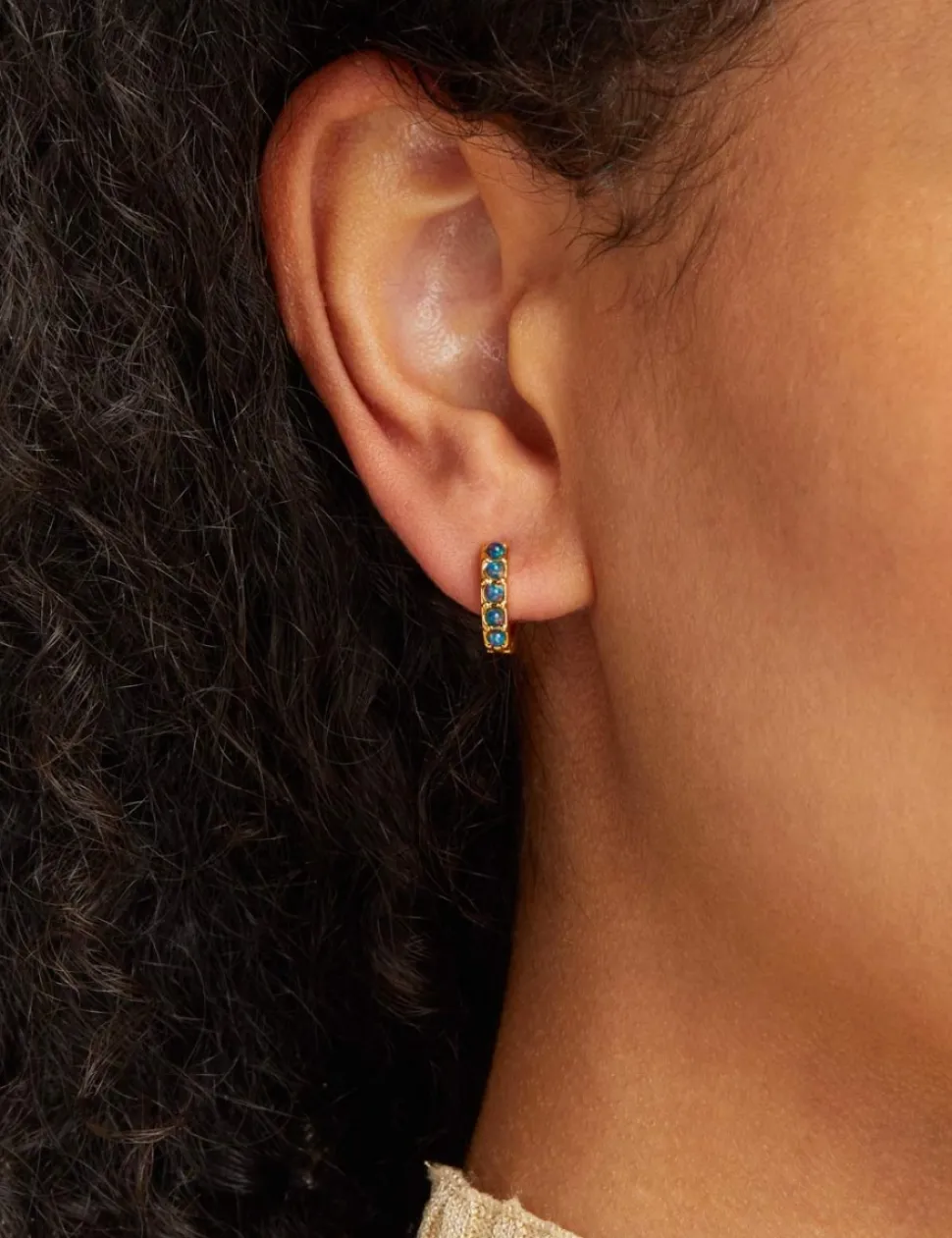 The Austral Sphere Huggie In Gold/Green From Our Fall 2023 Collection, Luminosity. A Gold Plated Huggie Earring Featuring Synthetic Opal Stones Throughout.- 20Kt Gold Plated Brass