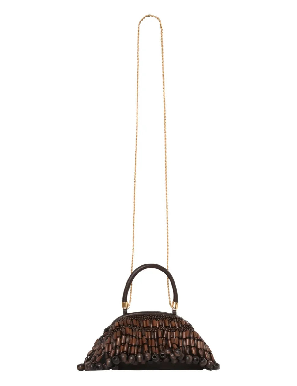 The Beaded Mini Purse In Chocolate From Our Resort 2024 Collection. A Beaded Purse Featuring A Gold Brass Chain.- Leather Beaded Purse