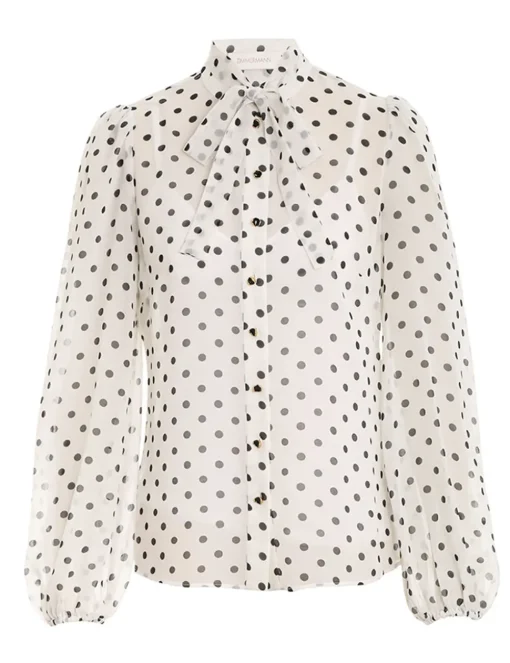 The Button Shirt In Cream/Black Dot From Our Fall 2023 Collection, Luminosity. A Button Up Long Sleeve Shirt Featuring A Detachable Neck Tie, Gathered Sleeves And A Centre Back Box Pleat.- Long Sleeve Blouse