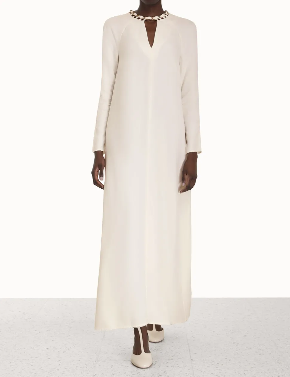 The Chain Embellished Maxi In Cream From Our Fall 2023 Collection, Luminosity. A Long Sleeve Maxi Dress Featuring A Chain Detail Neckline And Back Necktie.- Maxi Dress