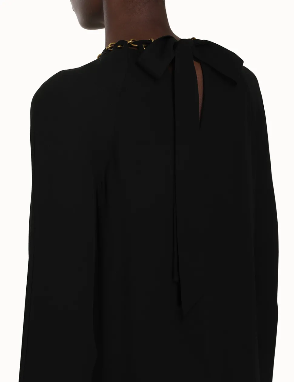 The Chain Embellished Maxi In Black From Our Fall 2023 Collection, Luminosity. A Long Sleeve Maxi Dress Featuring A Chain Detail Neckline And Back Necktie.- Maxi Dress