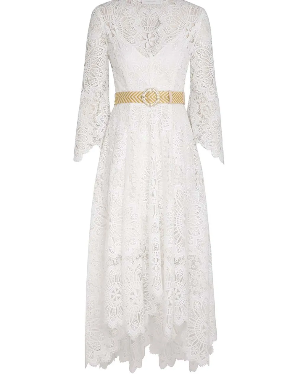 The Chintz Doily Lace Dress In Ivory From Our Summer Swim 2023 Collection. A Midi Dress Featuring Doily Lace Throughout, Finished With An Asymmetric Hem And Scalloped Edges.- Lace Midi Dress