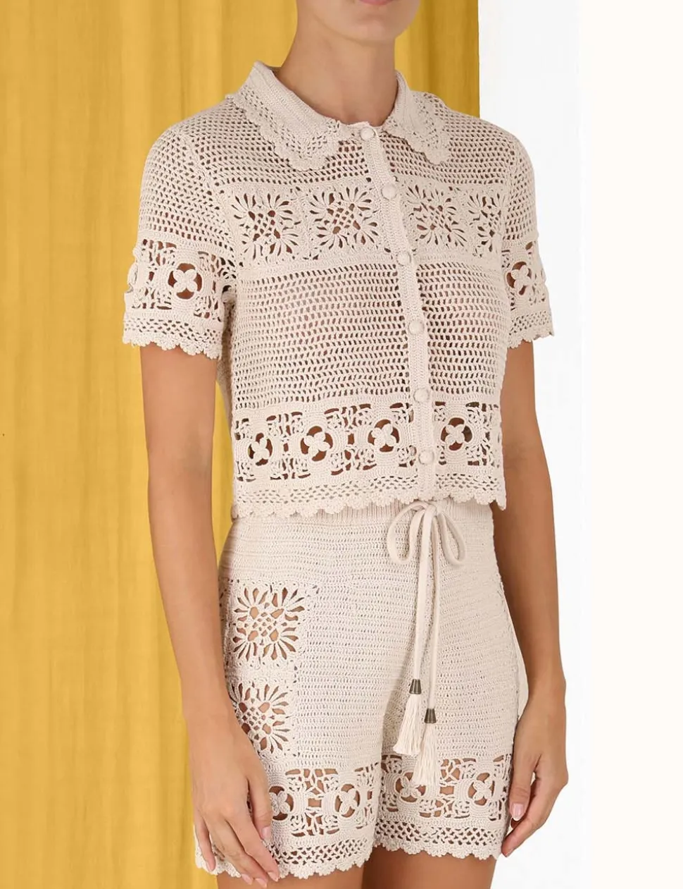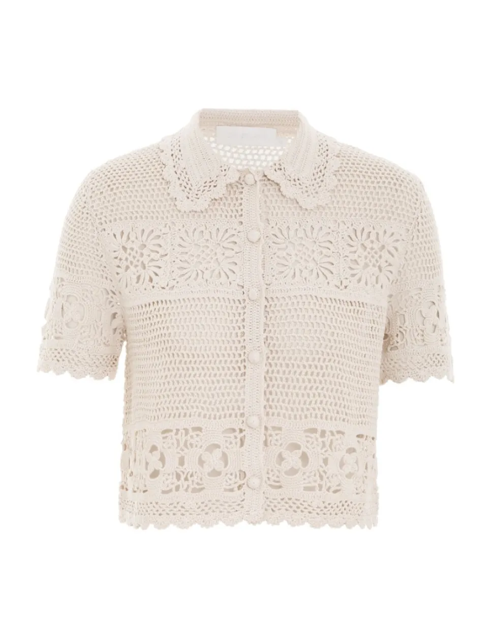 The Chintz Hand Crochet Shirt In Natural From Our Summer Swim 2023 Collection. A Hand Crochet Cropped Shirt Featuring A Classic Collar, Buttons Down The Centre Front And A Short Sleeve.- Short Sleeve Shirt
