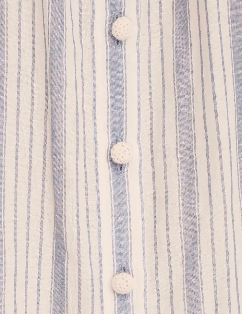 The Chintz Striped Billow Blouse In Blue/White Stripe From Our Summer Swim 2023 Collection. A Cotton Blouse Featuring A Stand Collar And Exaggerated Sleeves.- Cotton Blouse