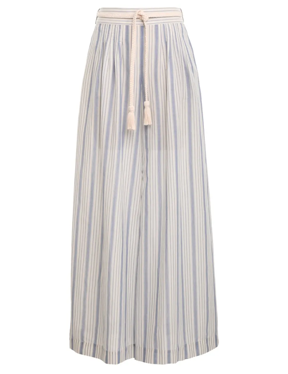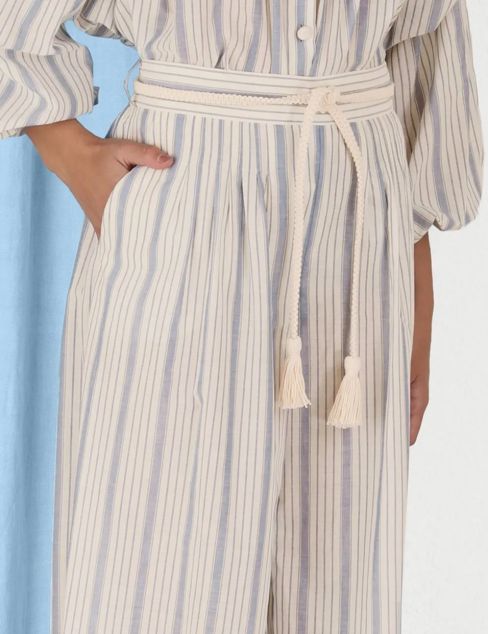The Chintz Striped Relaxed Pant In Blue/White Stripe From Our Summer Swim 2023 Collection. A Cotton Pant Featuring A High Waisted, Wide Leg Silhouette And A Macrame Belt With Tassel Ends.- Cotton Pant