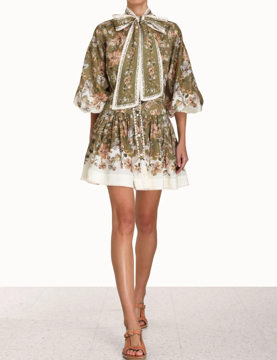 The Chintz Tie Neck Mini Dress In Khaki Daisy Floral From Our Summer Swim 2023 Collection. A Linen Mini Dress Featuring A Self Tie Neck, Exaggerated Sleeves And Embroidered Trims Throughout.- Linen Mini Dress
