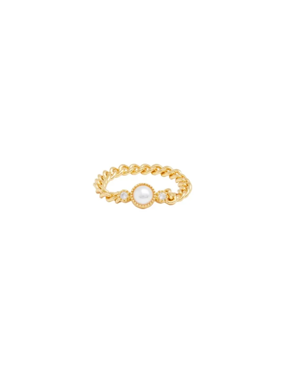 The Collage Fine Chain Ring In Gold From Our Spring 2023 Collection, Wonderland. A Gold Plated Fine Chain Ring Featuring A Pearl And Cubic Zirconia Stones.- 20K Gold Plated