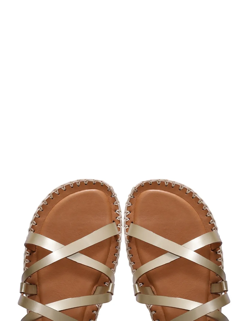 The Criss-Cross Sandal In Gold From Our Summer Swim 2023 Collection. A Leather Sandal Featuring Criss-Crossed Straps And Buckle Ankle Fastening.- Leather Sandal