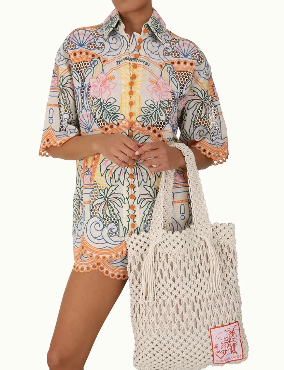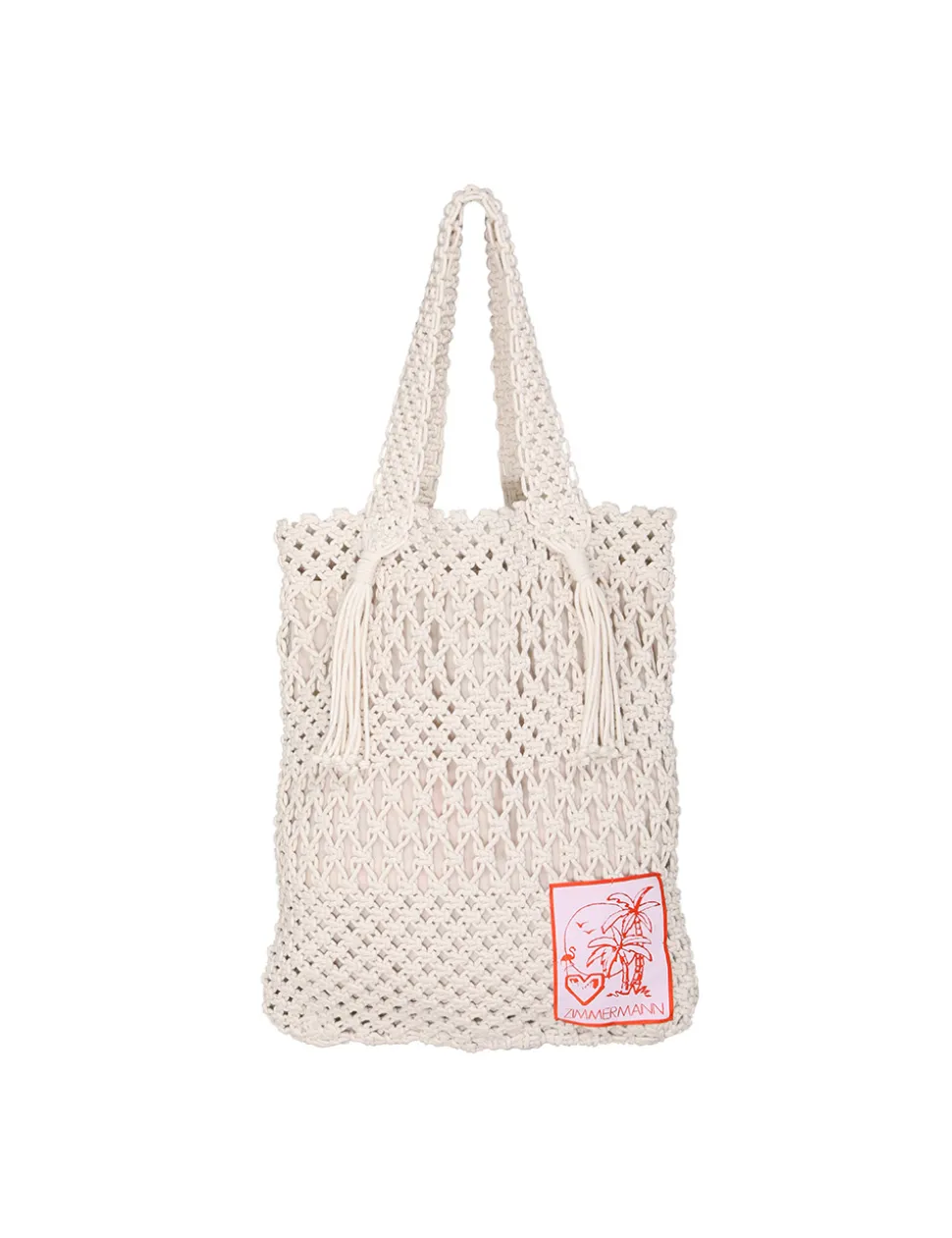 The Crochet Tote In Ivory From Our Summer Swim 2023 Collection. A Crochet Tote Bag Featuring Tassel Details And A Zimmermann Patch Motif.- Crochet Tote Bag
