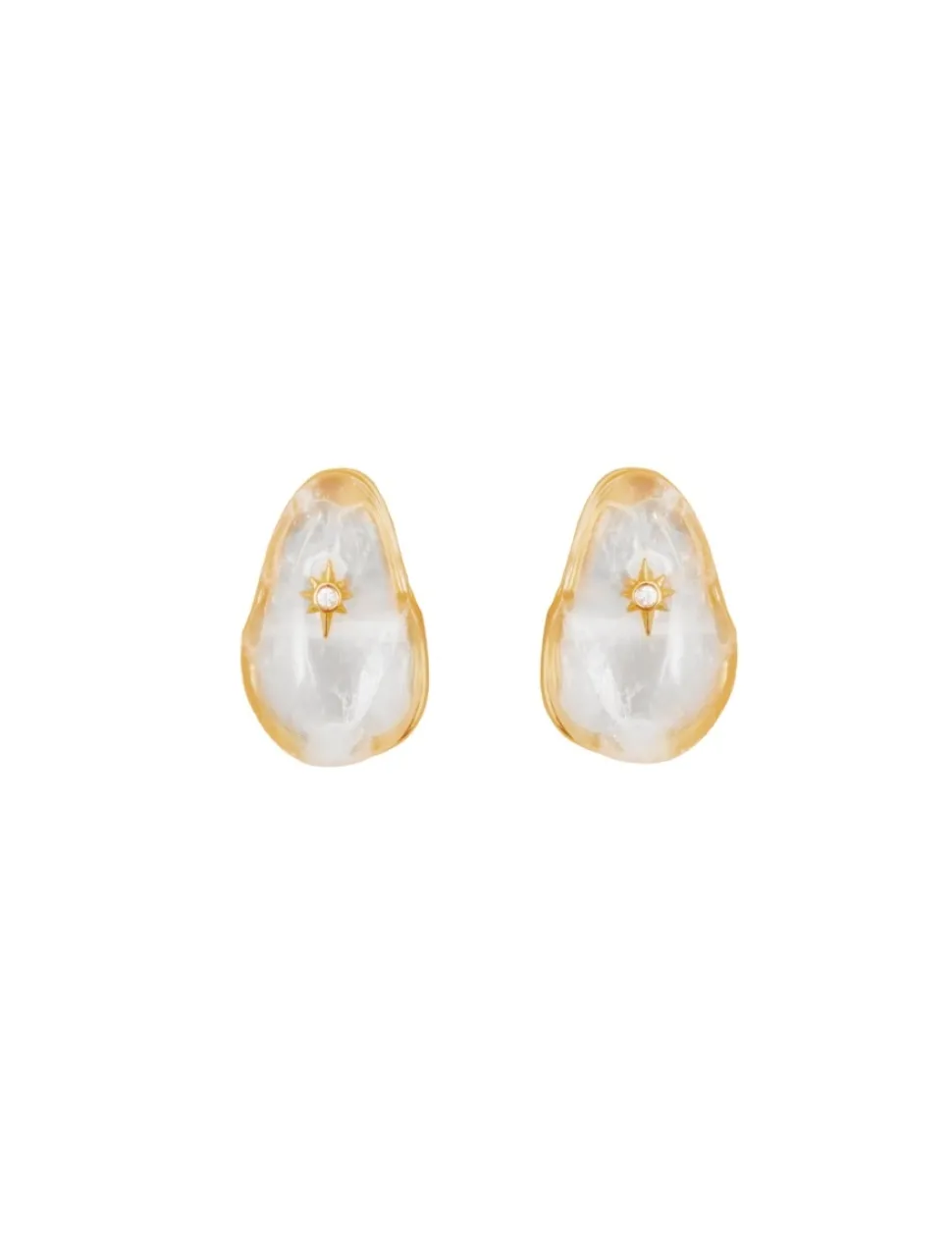The Crystal Pebble Earrings In Gold/Transparent Quartz From Our Fall 2023 Collection, Luminosity. A Gold Plated Earring Featuring Transparent Quartz And A Single Cubic Zirconia Stone.- 20Kt Gold Plated Brass