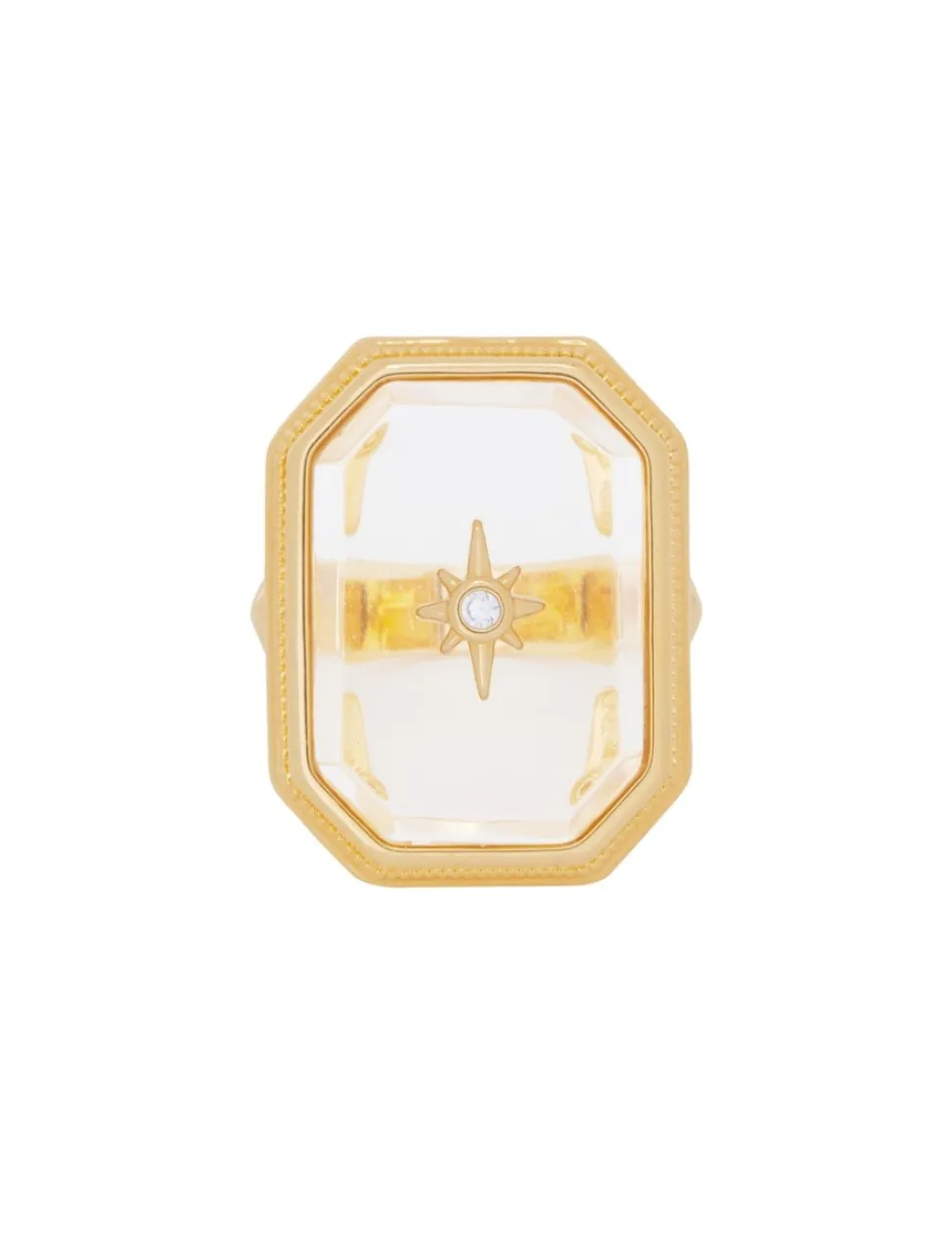 The Crystal Signet Ring In Gold/Transparent Quartz From Our Fall 2023 Collection, Luminosity. A Gold Pleated Ring Featuring Transparent Quartz And A Cubic Zirconia Stone.- 20Kt Gold Plated Brass