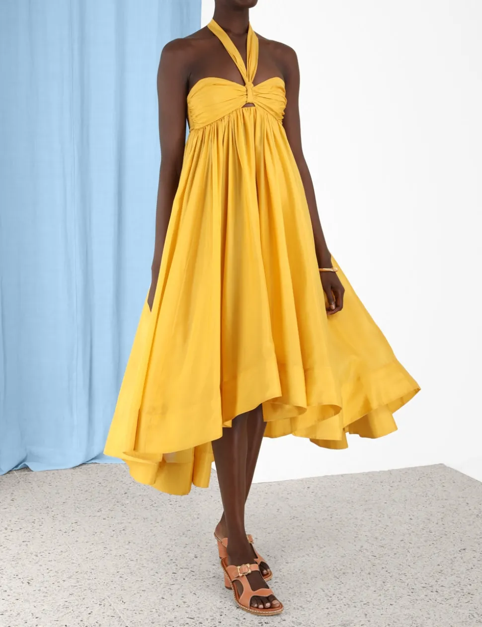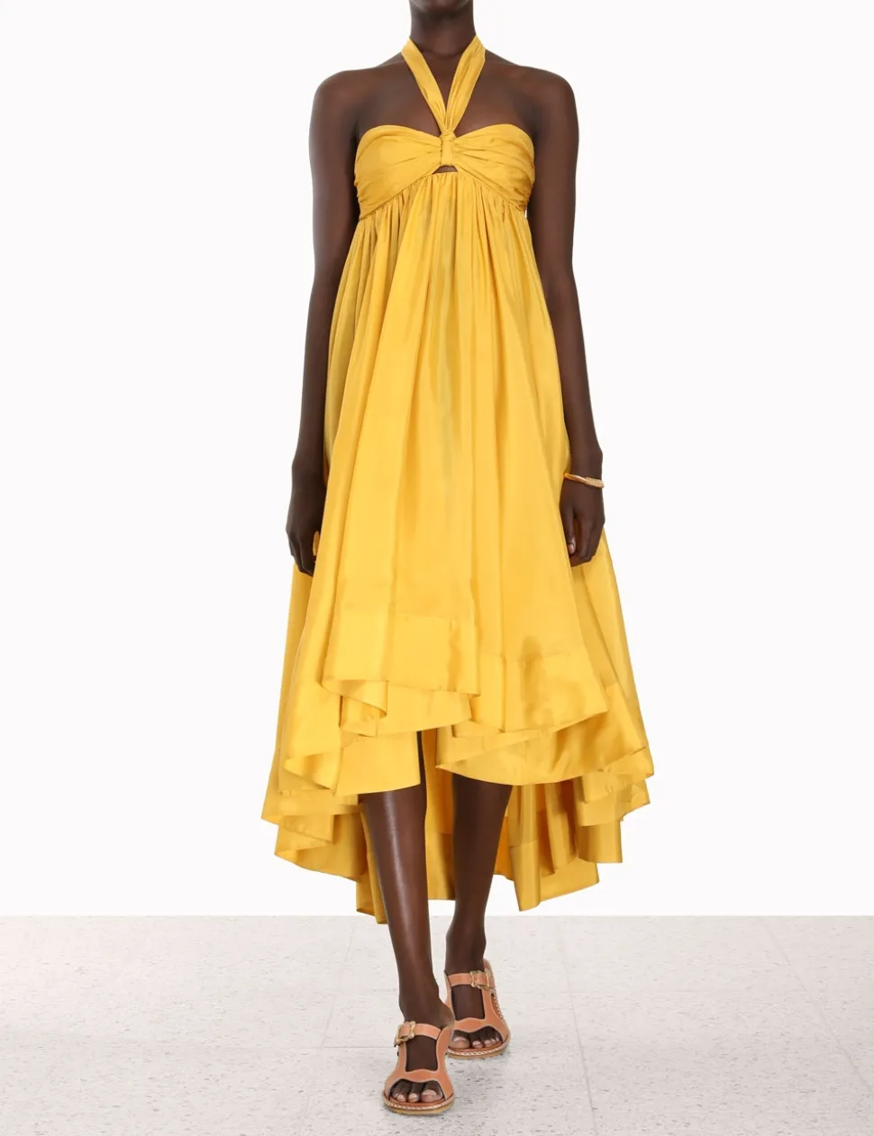 The Devi Halter Maxi Dress In Mustard From Our Summer Swim 2023 Collection. A Silk Maxi Dress Featuring An Asymmetric Hem And A Sweetheart Neckline With A Self Tie Halter Neck.- Silk Dress