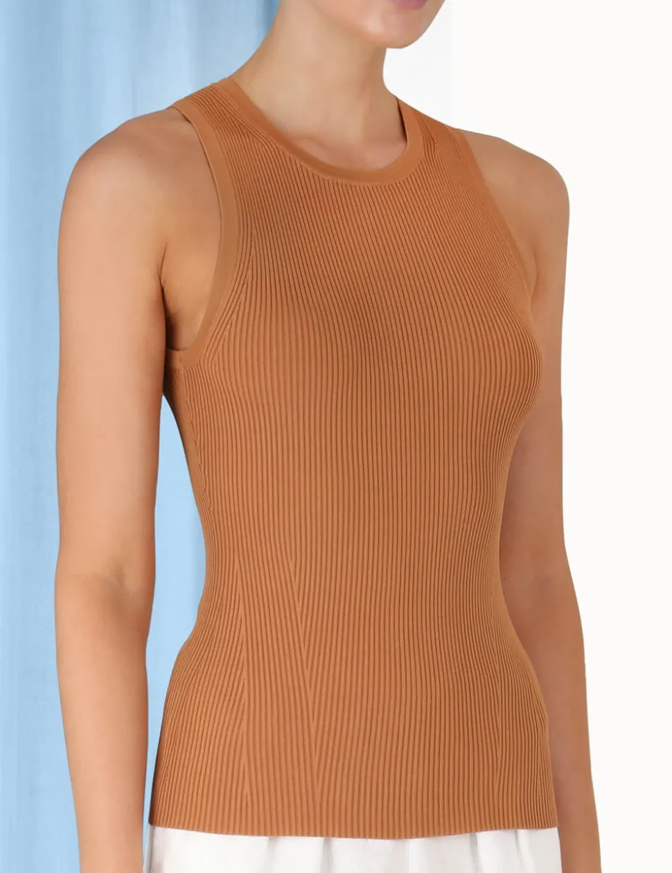 The Devi Knit Racer Tank In Tan From Our Summer Swim 2023 Collection. A Ribbed Knit, Fitted Tank With A Racerback Silhouette.- Fitted Ribbed Tank