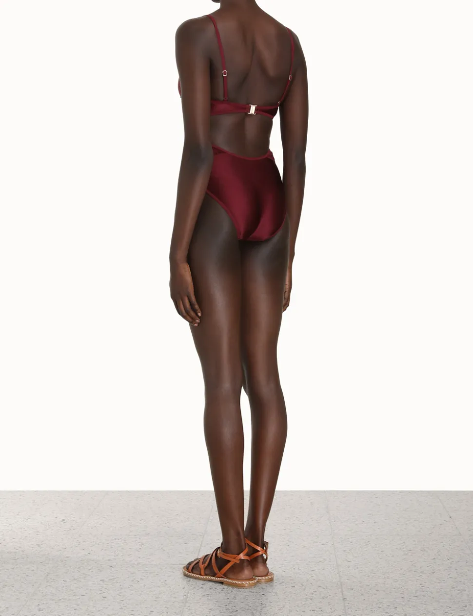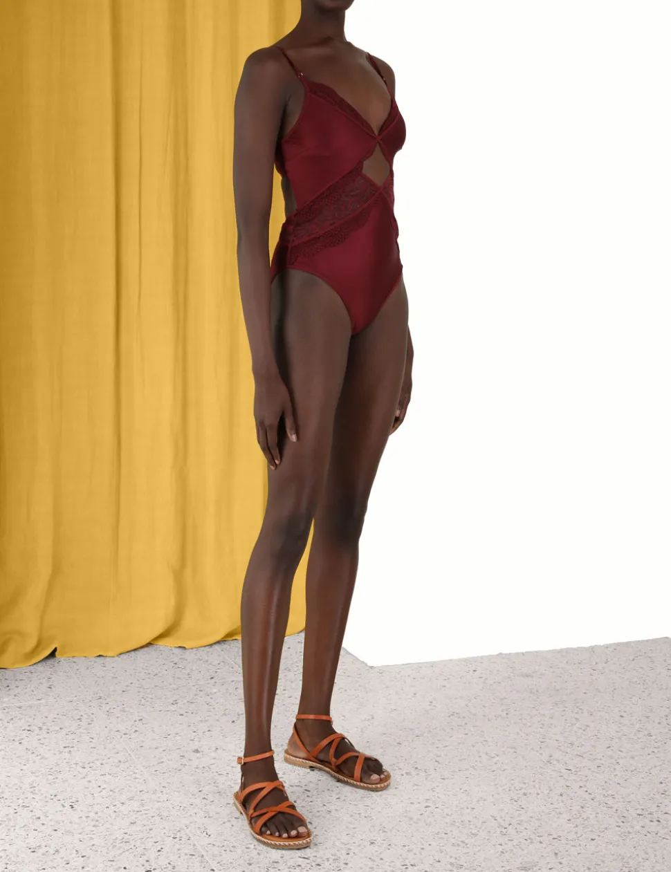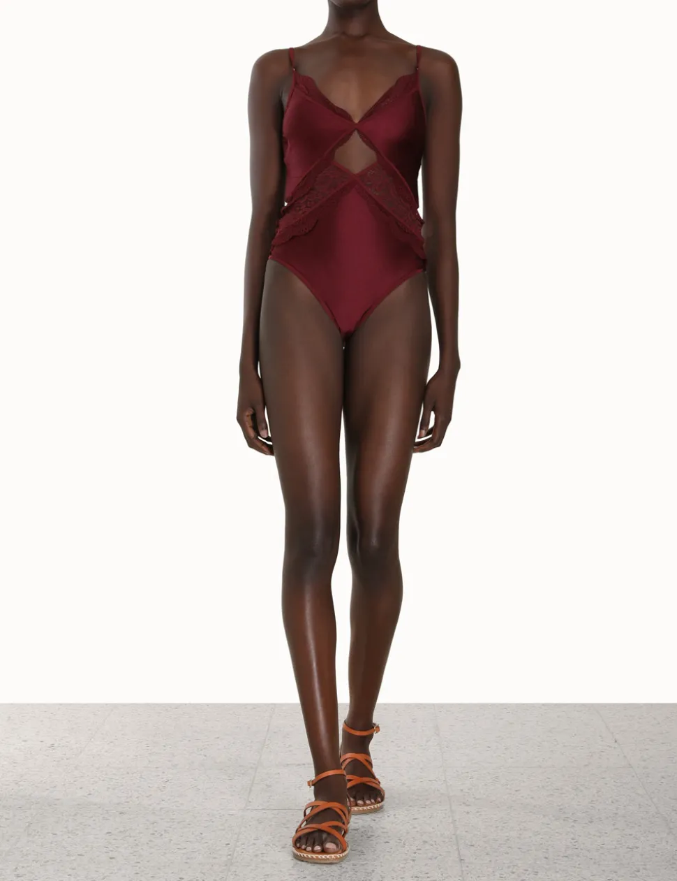 The Devi Lace Cutout 1Pc In Burgundy From Our Summer Swim 2023 Collection. A Shiny Lycra One Piece Featuring A Scalloped Elastic Trim With Scalloped Lace, Adjustable Shoulder Straps, And A Centre Back Clip.- Shiny Lycra One Piece