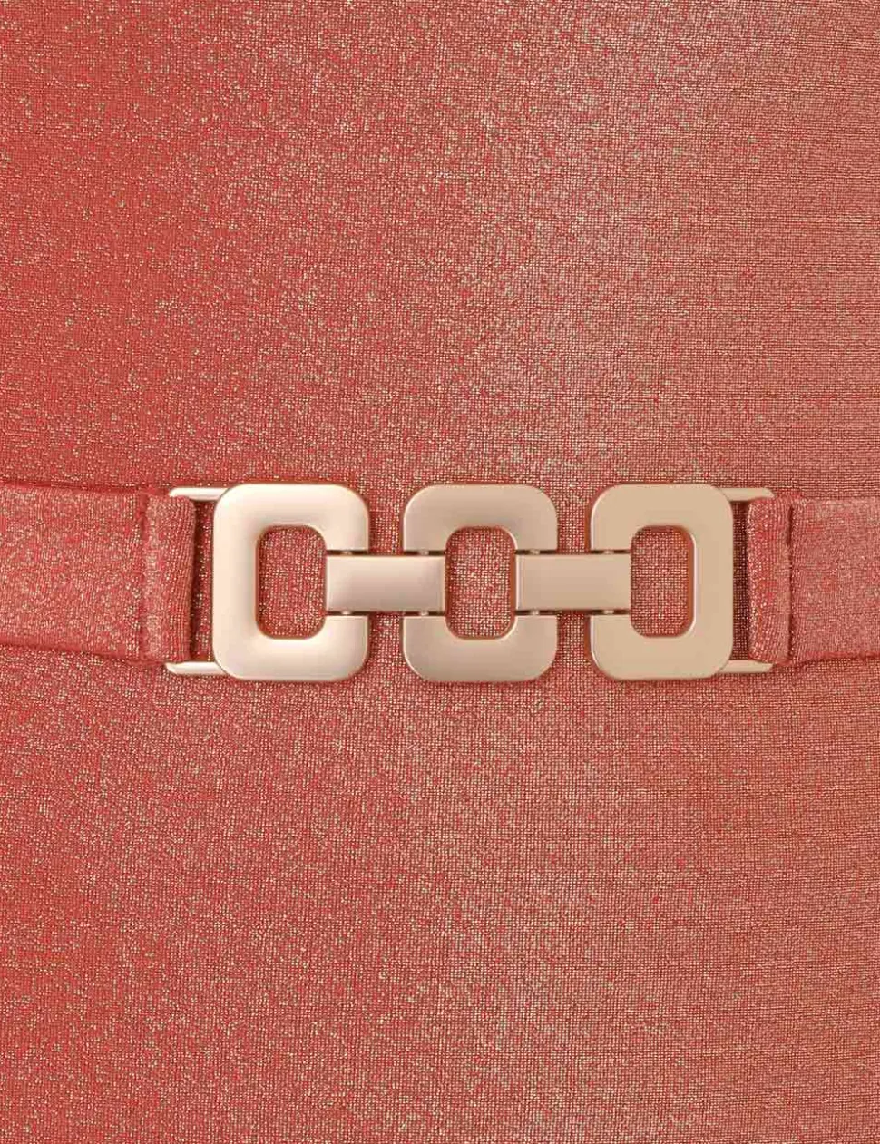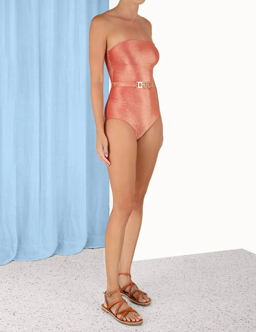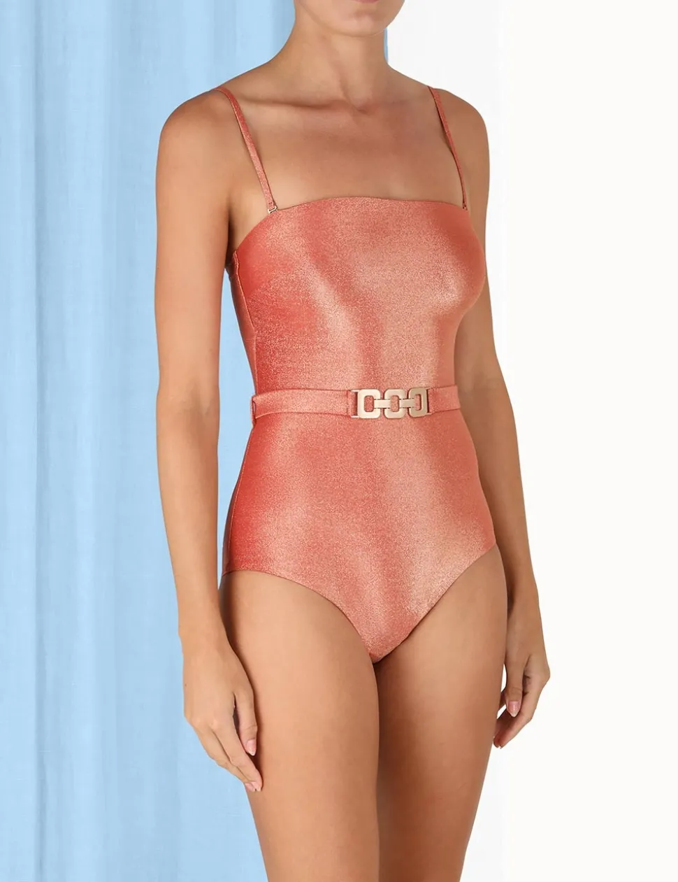 The Devi Lurex Chain Link 1Pc In Coral From Our Summer Swim 2023 Collection. A Lurex Lycra Bandeau One Piece Featuring Boning In The Side Seams, A Shelf Bra And A Removable Self Cover Belt With Chain Link Detailing.- Lurex Lycra