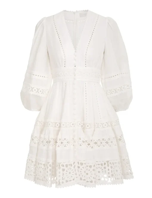The Devi Spliced Billow Mini Dress In Ivory From Our Summer Swim 2023 Collection. A Spliced Linen Midi Dress Featuring A Gathered Drop Hem And Cutaway Crotchet Trims Throughout.- Linen Dress