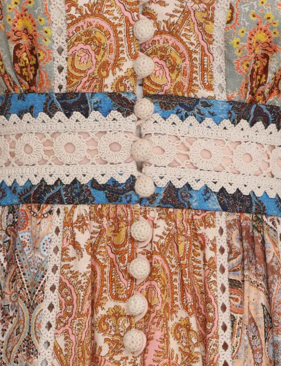 The Devi Spliced Midi Dress In Spliced Paisley From Our Summer Swim 2023 Collection. A Spliced Linen Midi Dress Featuring A Gathered Drop Hem And Cutaway Crotchet Trims Throughout.- Linen Dress