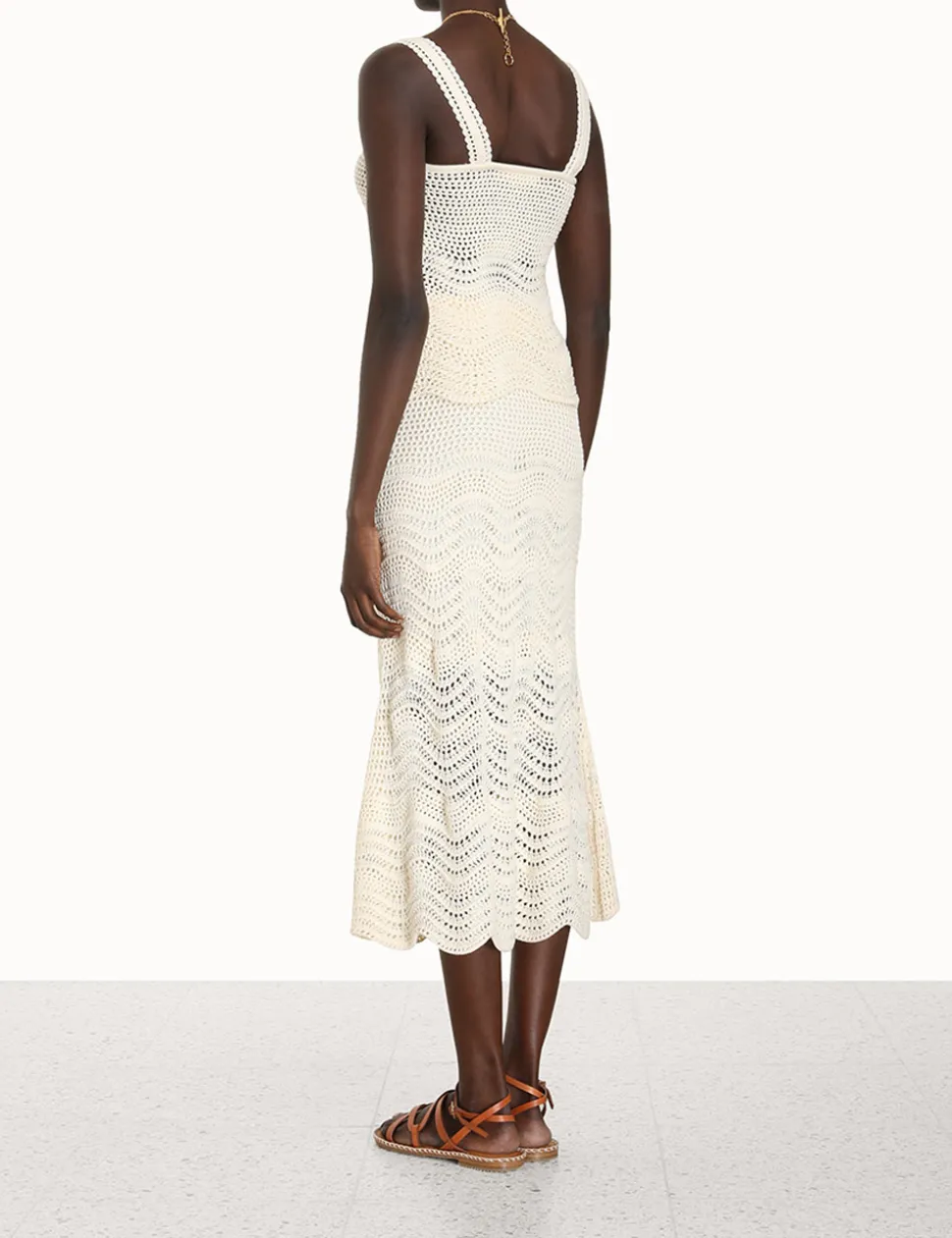 The Devi Textured Knit Tank In Cream From Our Summer Swim 2023 Collection. A Knitted Tank Top Featuring A Lace Up Yoke And Scalloped Texture Throughout.- Knitted Tank