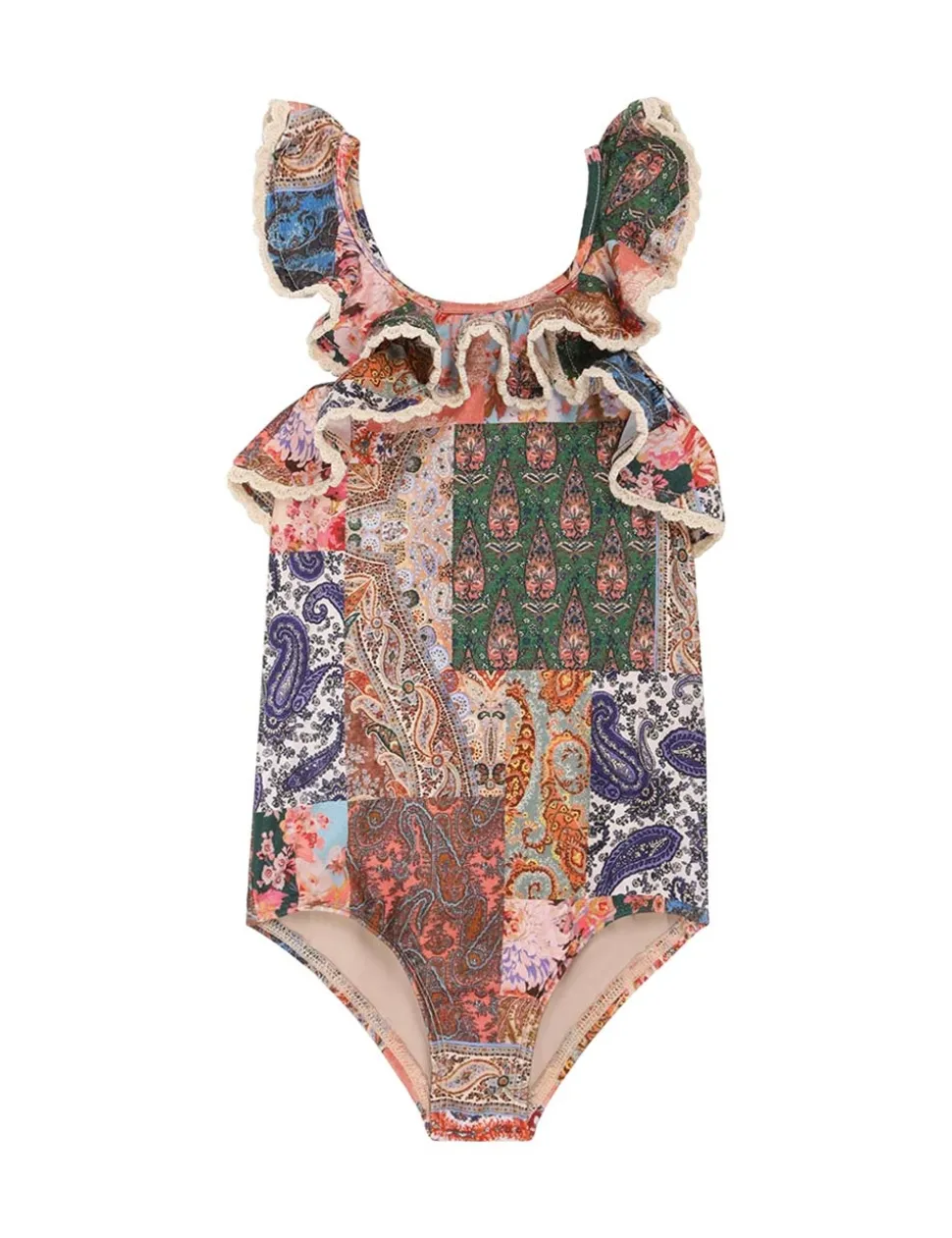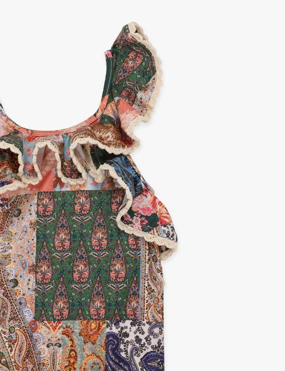 The Devi Trim Frill 1Pc In Patch Paisley From Our Summer Swim 2023 Collection. A Lycra One Piece Featuring Frills Throughout And A Cross Over Back.- Lycra One Piece