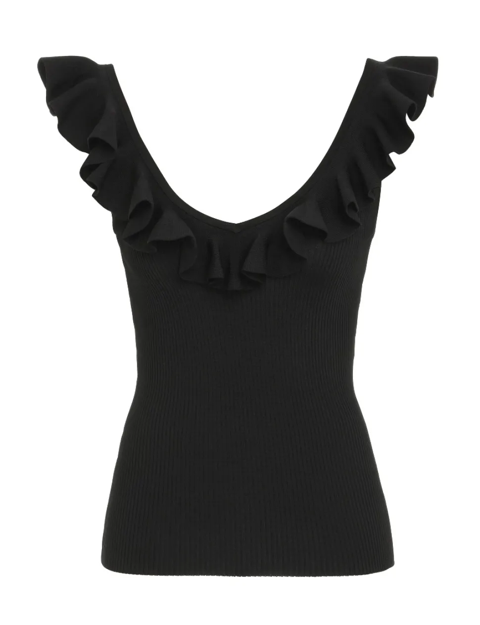 The Devi V-Neck Frill Tank In Black From Our Summer Swim 2023 Collection. A Ribbed Knit, Fitted Tank With A Frilled Scoop Neckline.- Fitted, Ribbed Tank