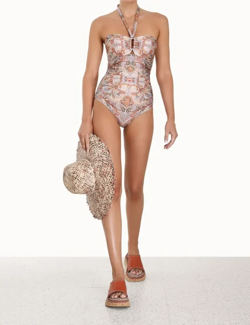 The Devi Wide Link 1Pc In Multi Paisley From Our Summer Swim 2023 Collection. A Halter Neck One Piece With Ruched Sides And Wide Link Detail At Centre Bust.- Shiny Italian Lycra