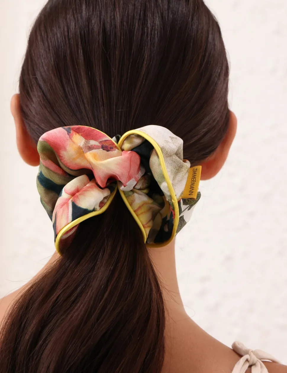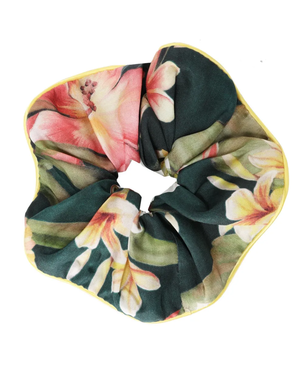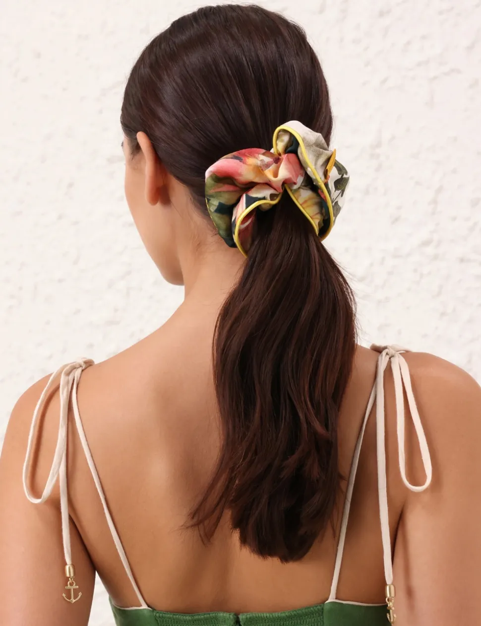 The Double Faced Silk Scrunchie In Ivory Palm From Our Resort 2024 Collection, Matchmaker. A Silk Scrunchie Featuring Contrast Piped Edges.- Silk Scrunchie