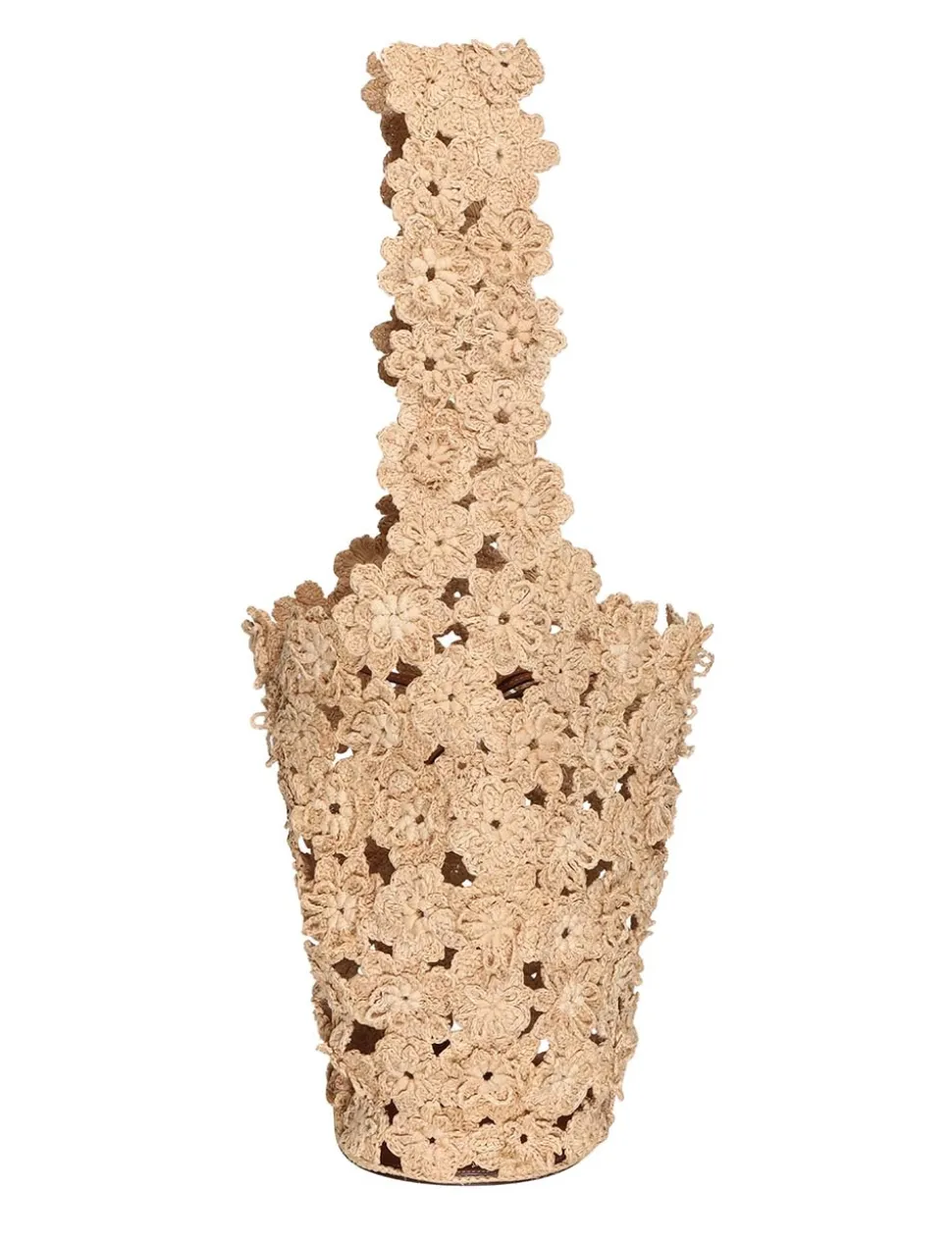 The Floral Crochet Tote In Natural From Our Summer Swim 2023 Collection. A Raffia Tote Featuring A Leather Tie Closure And Base.- Crochet Raffia Tote