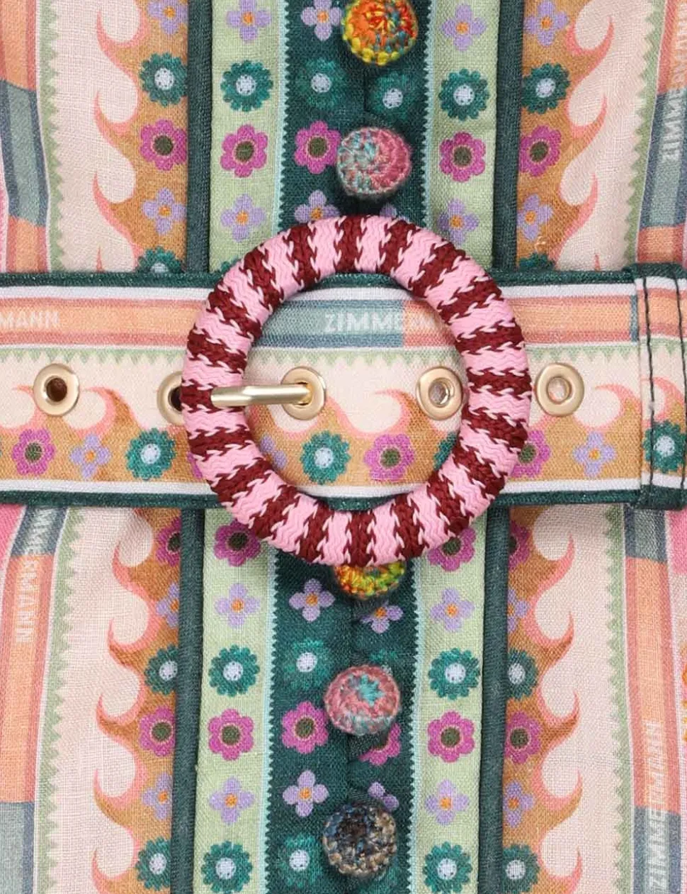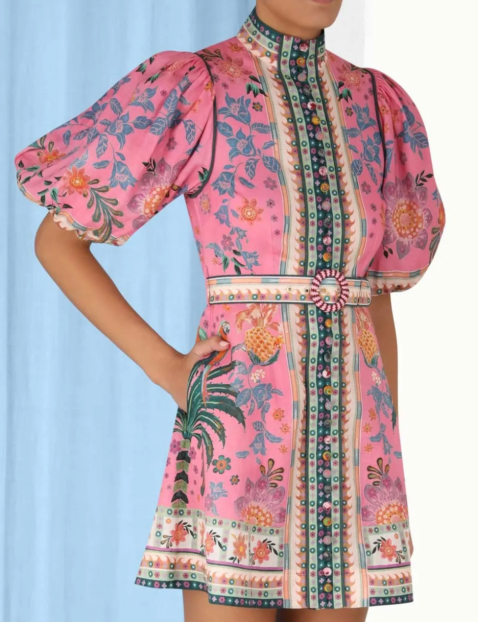 The Ginger Buttoned Mini Dress In Pink Multi From Our Summer Swim 2023 Collection. A Linen Mini Dress Featuring Short Blouson Sleeves And A Self Cover Belt.- Linen Mini Dress