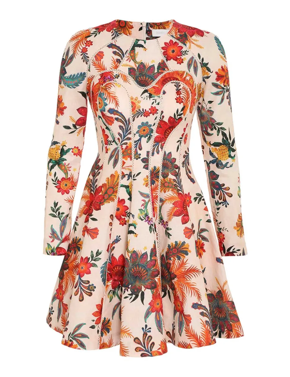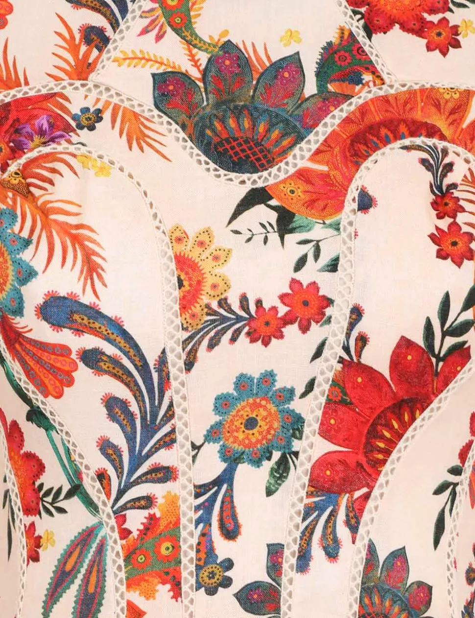 The Ginger Fit & Flare Mini Dress In Ivory Floral From Our Summer Swim 2023 Collection. A Linen Mini Dress Featuring Long Sleeves And Crochet Insert Trims Throughout.- Linen Mini Dress