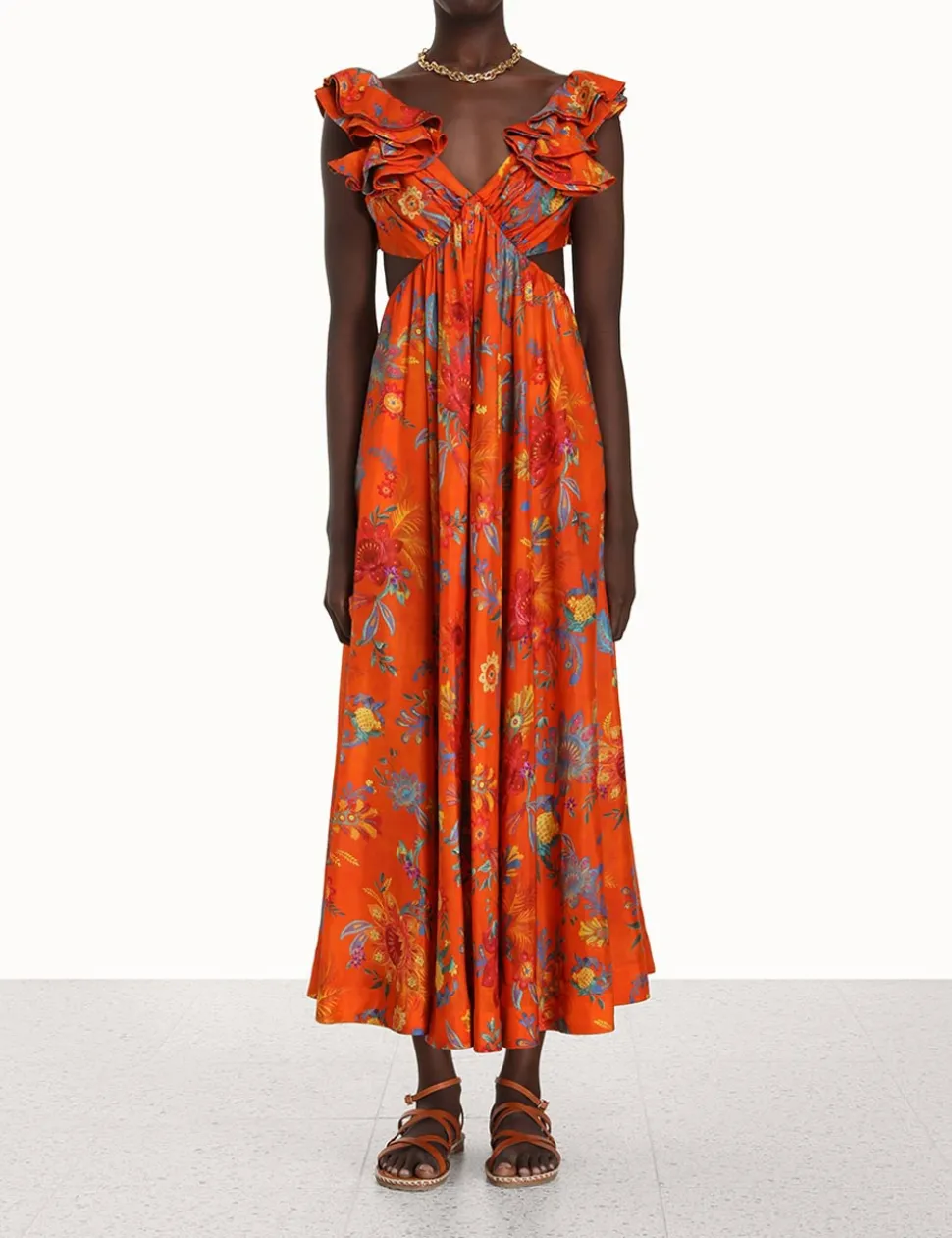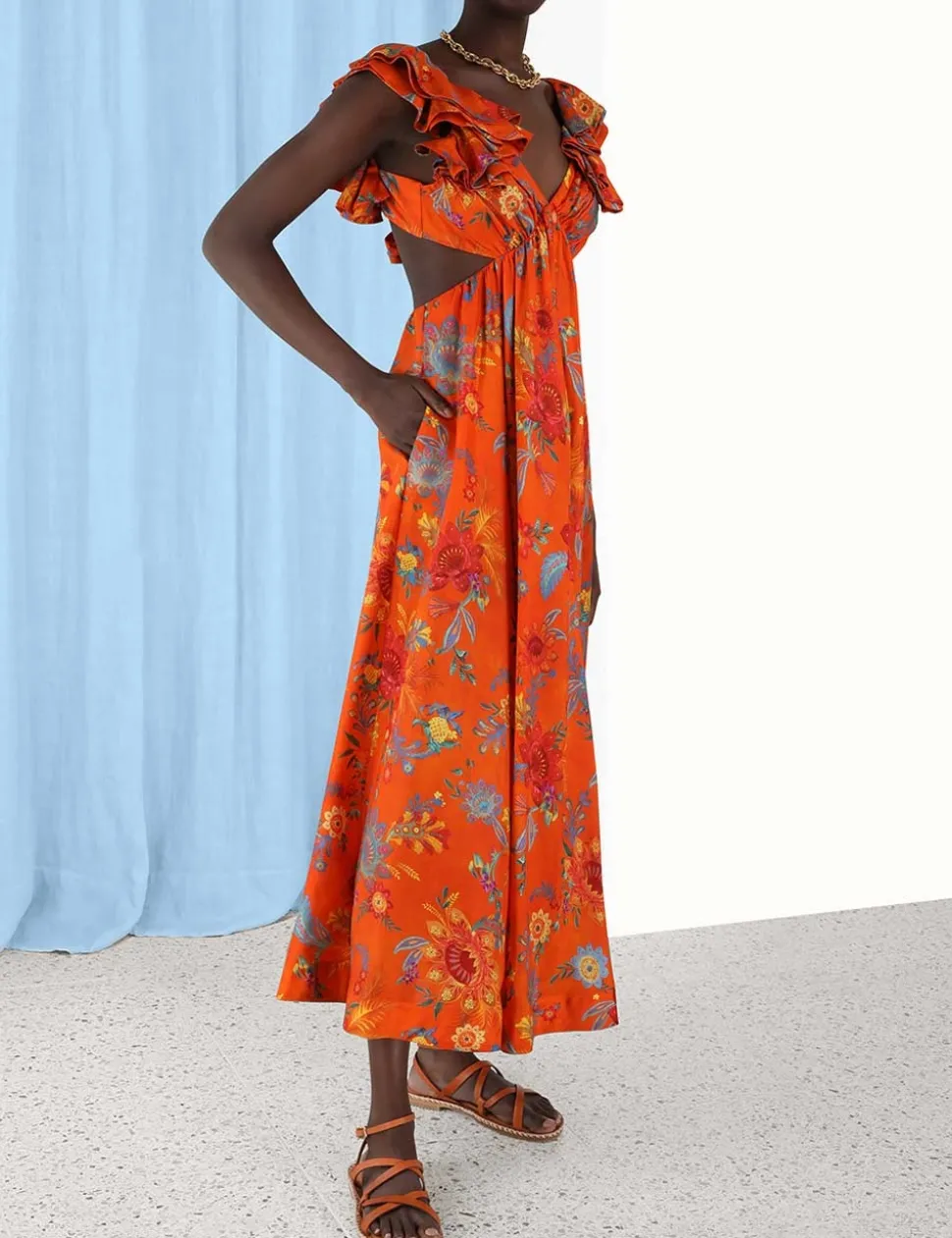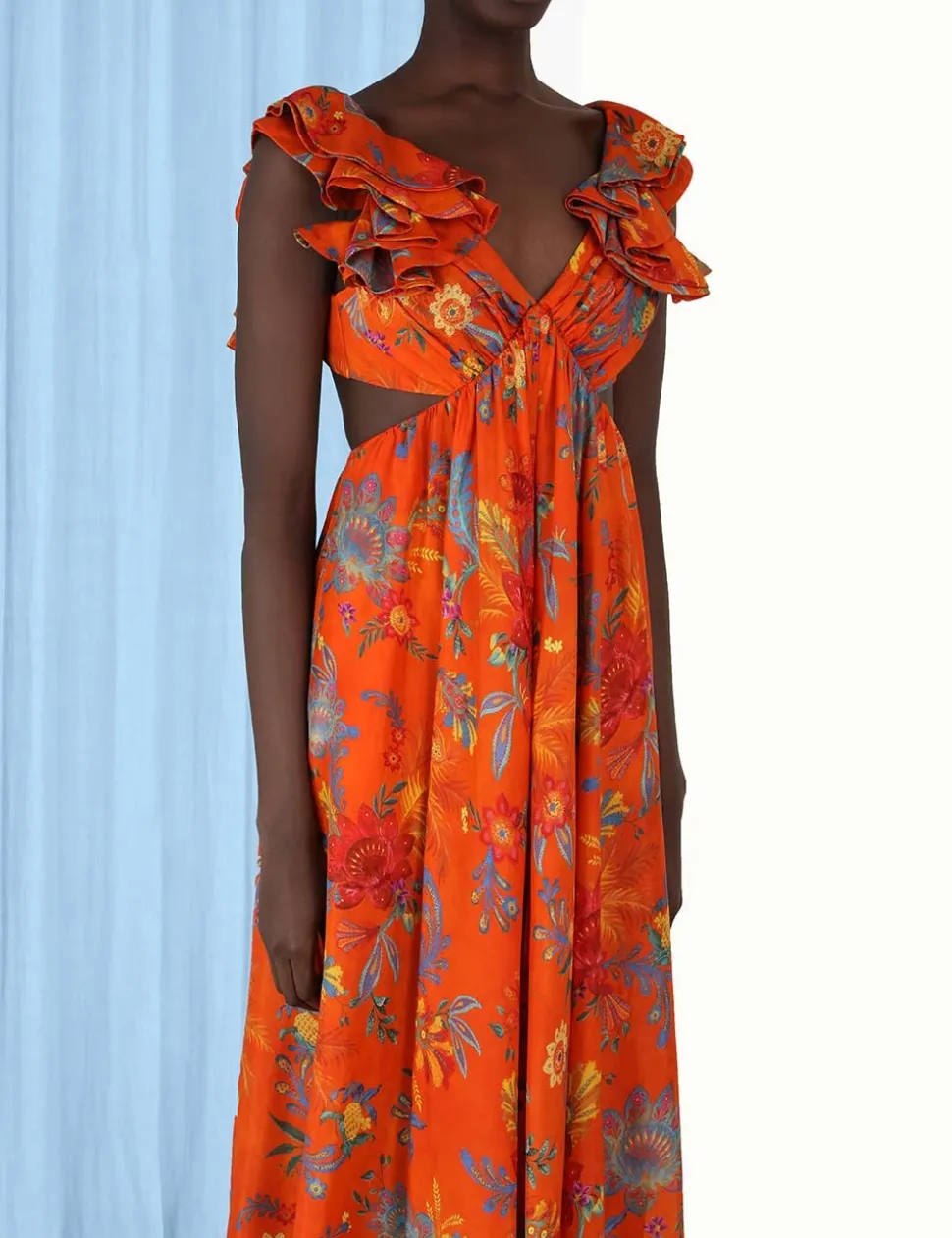 The Ginger Frill Midi Dress In Orange Floral From Our Summer Swim 2023 Collection. A Silk Maxi Dress Featuring A Cutaway Waist And Exaggerated Ruffle Details Throughout.- Silk Maxi Dress