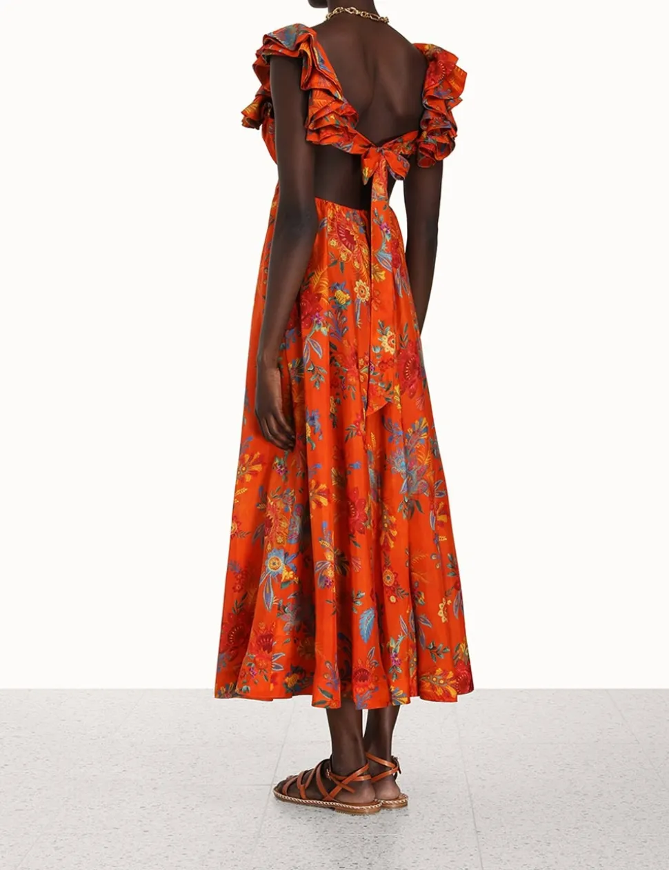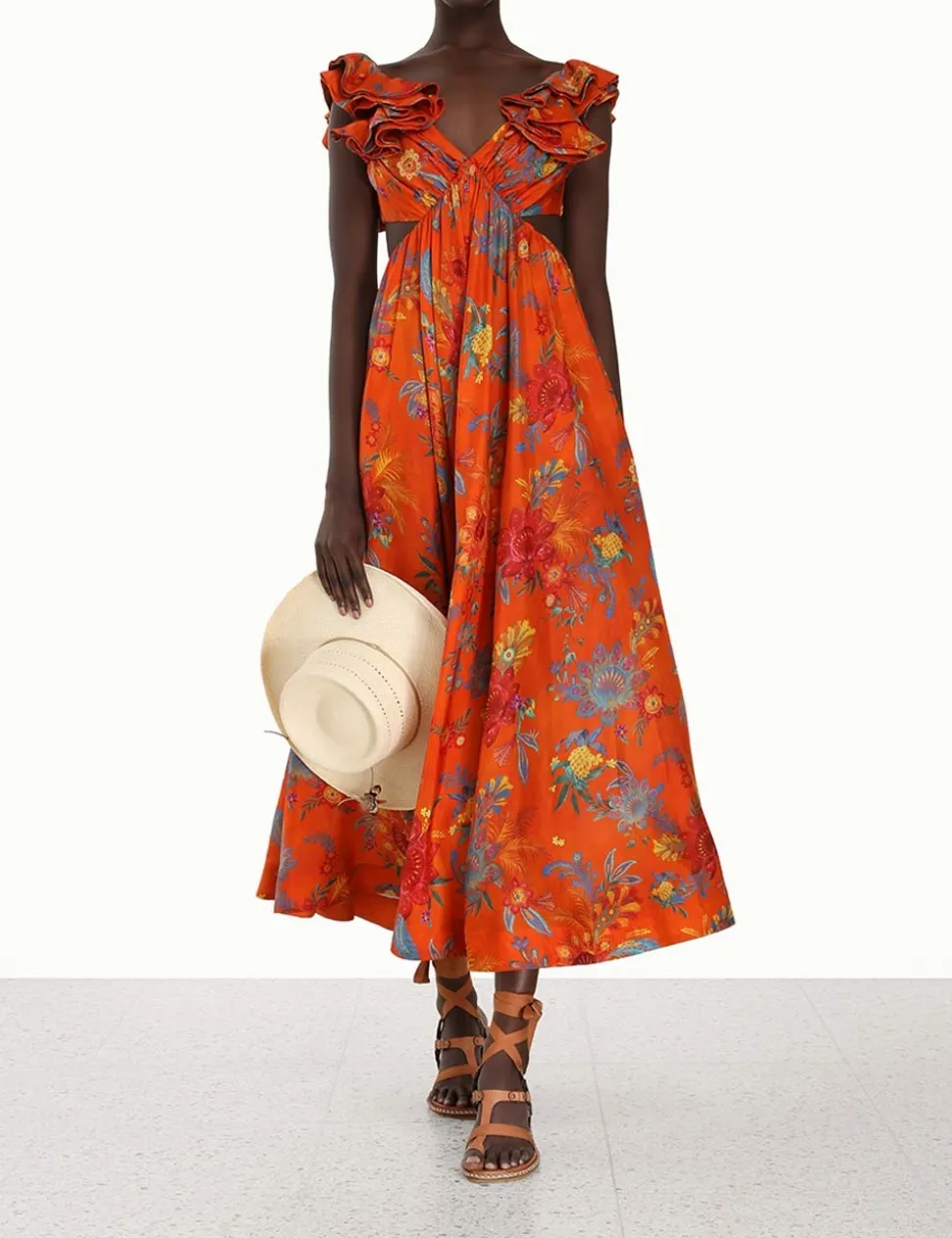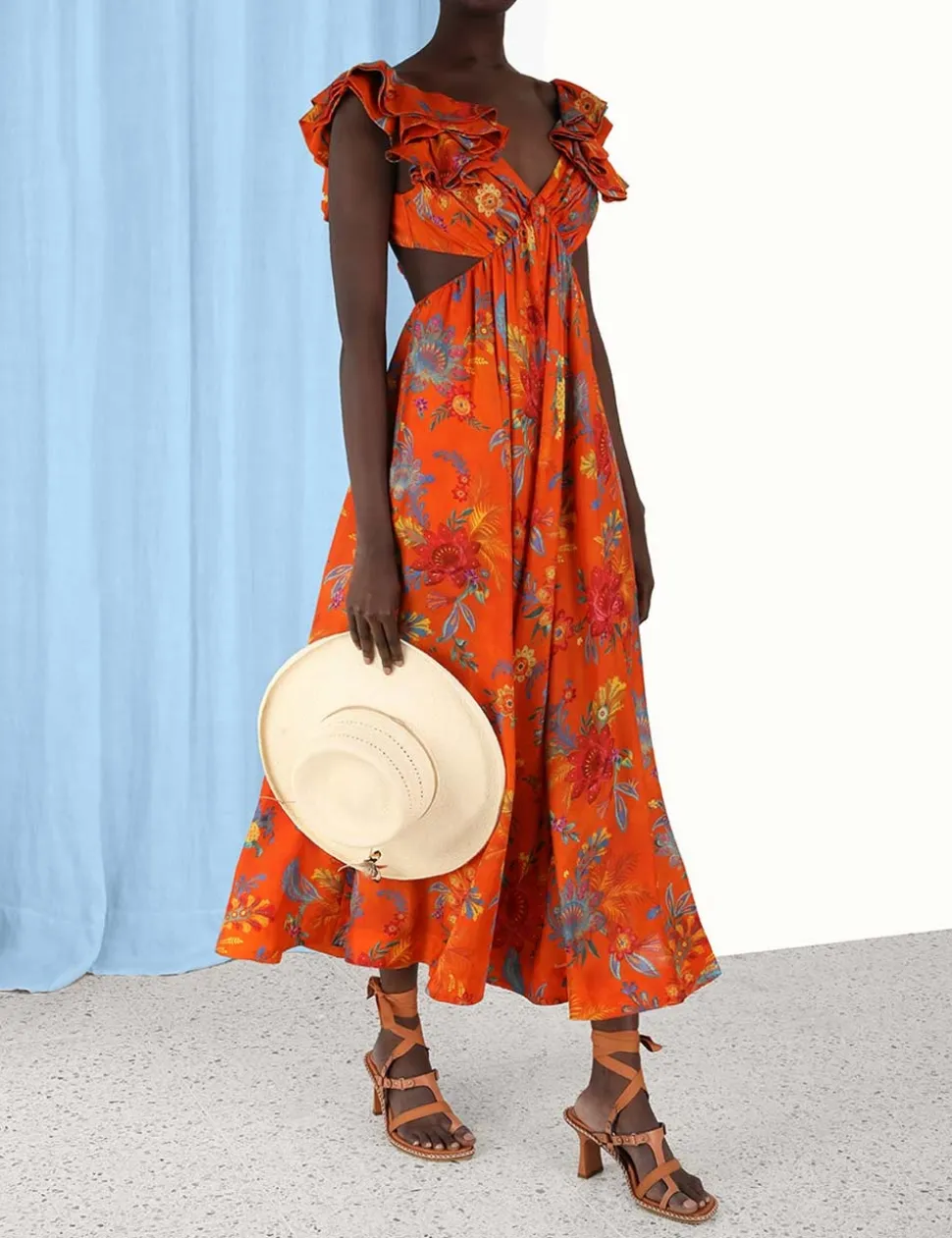 The Ginger Frill Midi Dress In Orange Floral From Our Summer Swim 2023 Collection. A Silk Maxi Dress Featuring A Cutaway Waist And Exaggerated Ruffle Details Throughout.- Silk Maxi Dress
