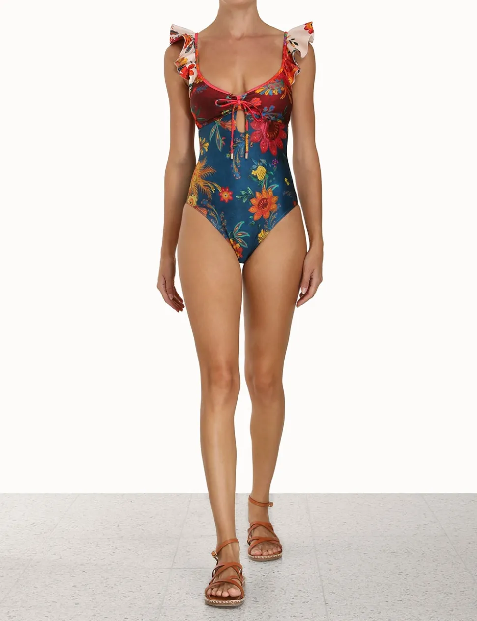 The Ginger Frill Shoulder 1Pc In Spliced From Our Summer Swim 2023 Collection. An Italian Lycra One Piece Featuring A Frilled Shoulders And Tie Front Bust.- Italian Lycra One Piece